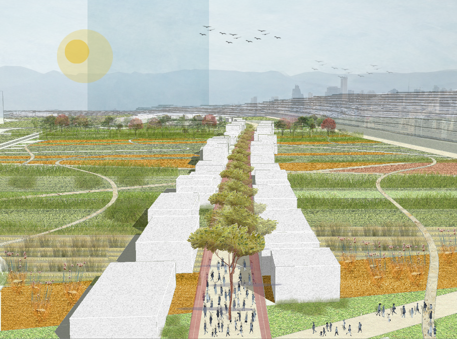a bird s eye perspective architectural visualization rendering of a reimagined beirut port landscape set against the iconic backdrop of the mediterranean coastal city at the center a straight pedestrian promenade reminiscent of the historic beirut souks of souq al jamil and souq al tawileh runs as the primary axis lined with a single row of tall slender mediterranean pine trees pinus pinea an emblematic tree of the lebanese coastline their umbrella like olive green canopies arching over the path below flanking the promenade symmetrically are rows of low rise flat roofed white cubic souk structures reinterpreted vernacular lebanese market buildings rendered in pale limestone textured volumes arranged in a rhythmic staggered stepping pattern that recedes into the distance evoking the collective clustering memory of old levantine souk streets the structures are simple and austere yet warm referencing the illiya and courtyard typologies of traditional beiruti residential architecture with minimal openings suggesting shadowed thresholds and sheltered passages between units the promenade surface is paved in terracotta red animated by small scale human figures dressed in everyday beiruti life families vendors students walking gathering and inhabiting the space the public life depicted is vibrant yet unhurried evoking the mediterranean rhythm of the street flanking the central axis on both sides are vast organically divided agricultural field plots rendered in a rich patchwork of warm tones amber burnt orange golden yellow and olive green separated by gently winding informal pathways referencing the fertile agricultural memory of the lebanese coastal plain and reclaiming the post blast port land with productive green landscape scattered throughout the fields are clusters of deciduous trees with seasonal pink rust orange and deep green foliage suggesting a forest like ecological buffer the overall scene is rendered as a photorealistic architectural visualization with physically accurate lighting material textures and atmospheric depth limestone surfaces catching the warm mediterranean sunlight terracotta pavement reflecting soft shadows cast by the pine canopies and field textures rendered with lifelike detail in grass soil and vegetation the rendering achieves the precision of a high resolution cinematic aerial photograph grounding the visionary design proposal firmly in tangible believable reality in the far distance the unmistakable beirut urban skyline emerges hazily with its layered mid rise and high rise silhouettes including industrial remnants of the port set against the iconic blue grey ridgeline of the lebanese mountain range jabal lubnan whose misty peaks frame the city as they always have the sky is pale blue grey with a stylized warm golden sun disc visible in the upper left and a loose flock of birds soaring freely in the upper right a quiet symbol of resilience and renewal over a city rebuilding itself the entire color palette warm earth tones mediterranean limestone white and cool mountain blues is rendered in a serene harmonious and hopeful architectural vision