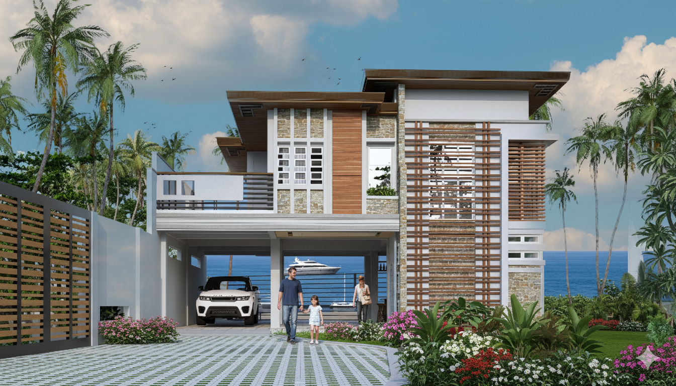 retain the image and make a realistic render with a nice ocean view sunset but remove the watch tower background and landscaping make the car more realistci and add people make the sunlight at the front of the image