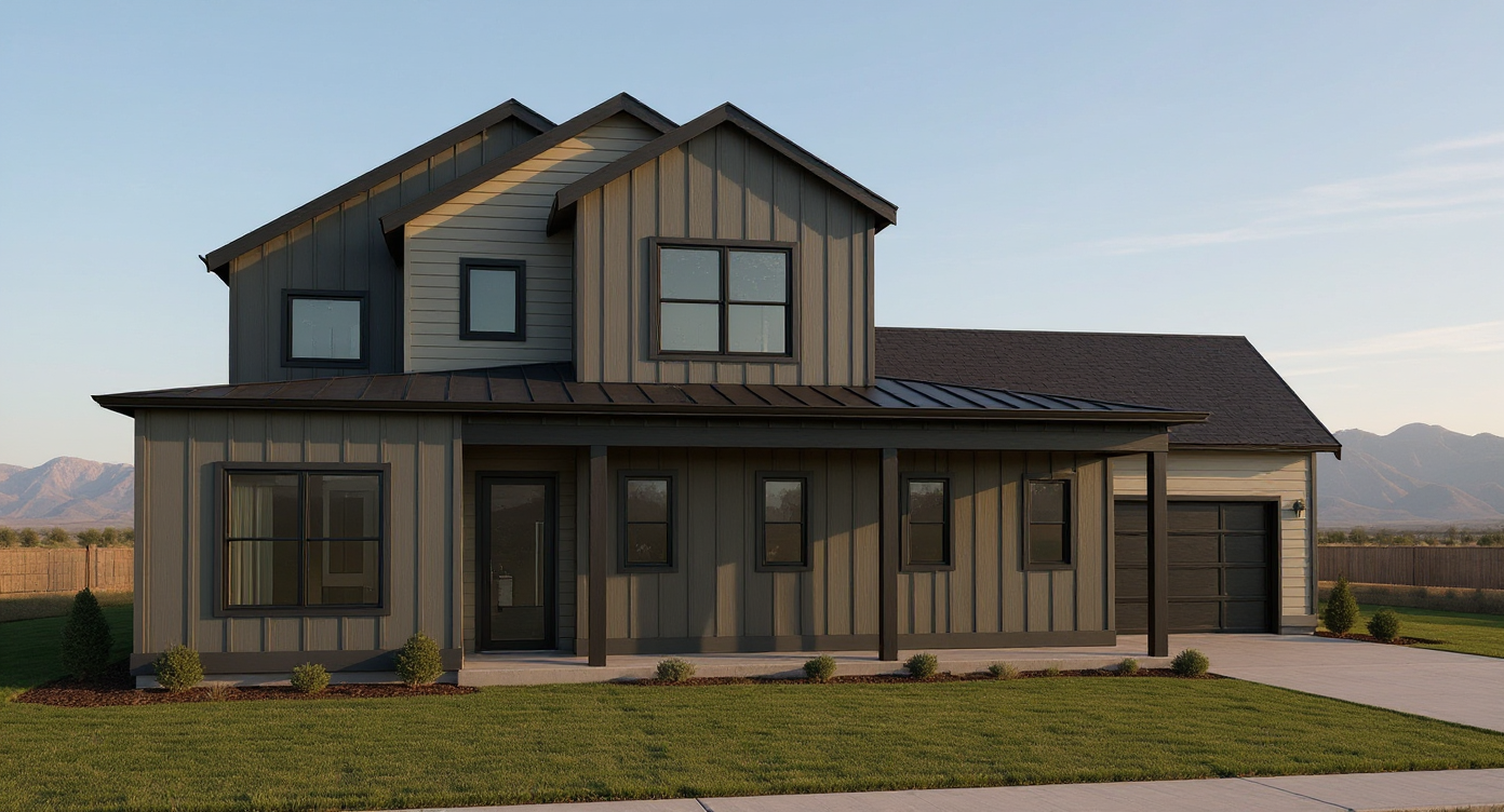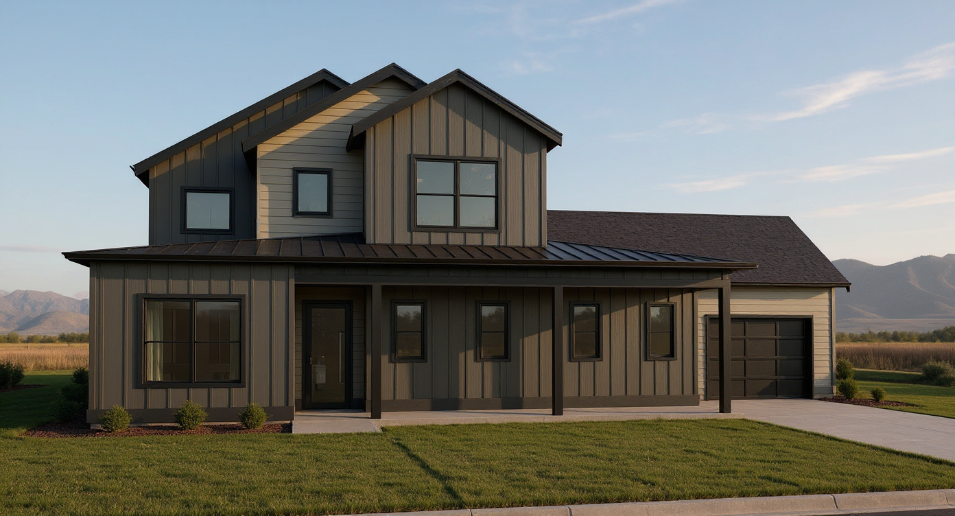 render a modern farmhouse with a sleek architectural design use dark charcoal gray for the exterior walls and roof with light gray accents around the windows and doors incorporate crisp white trims to highlight the structure s features create a warm and inviting atmosphere by applying soft sunlight giving the surrounding area a golden hue include subtle lush greenery to enhance the charm and add depth to the scene the overall vibe should be cozy yet contemporary