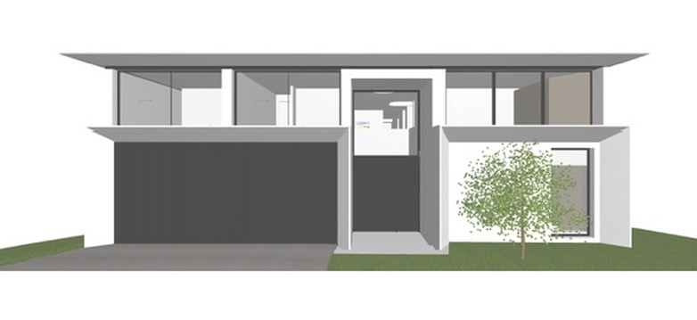 create a photo realistic render of this house the black garage and entry door is to be black timber battens slat window frame to be a dark brass colour off white acrylic render olive tree with cactus plants cobble stone driveway and foot path to entry door maintain the roof with angled facia
