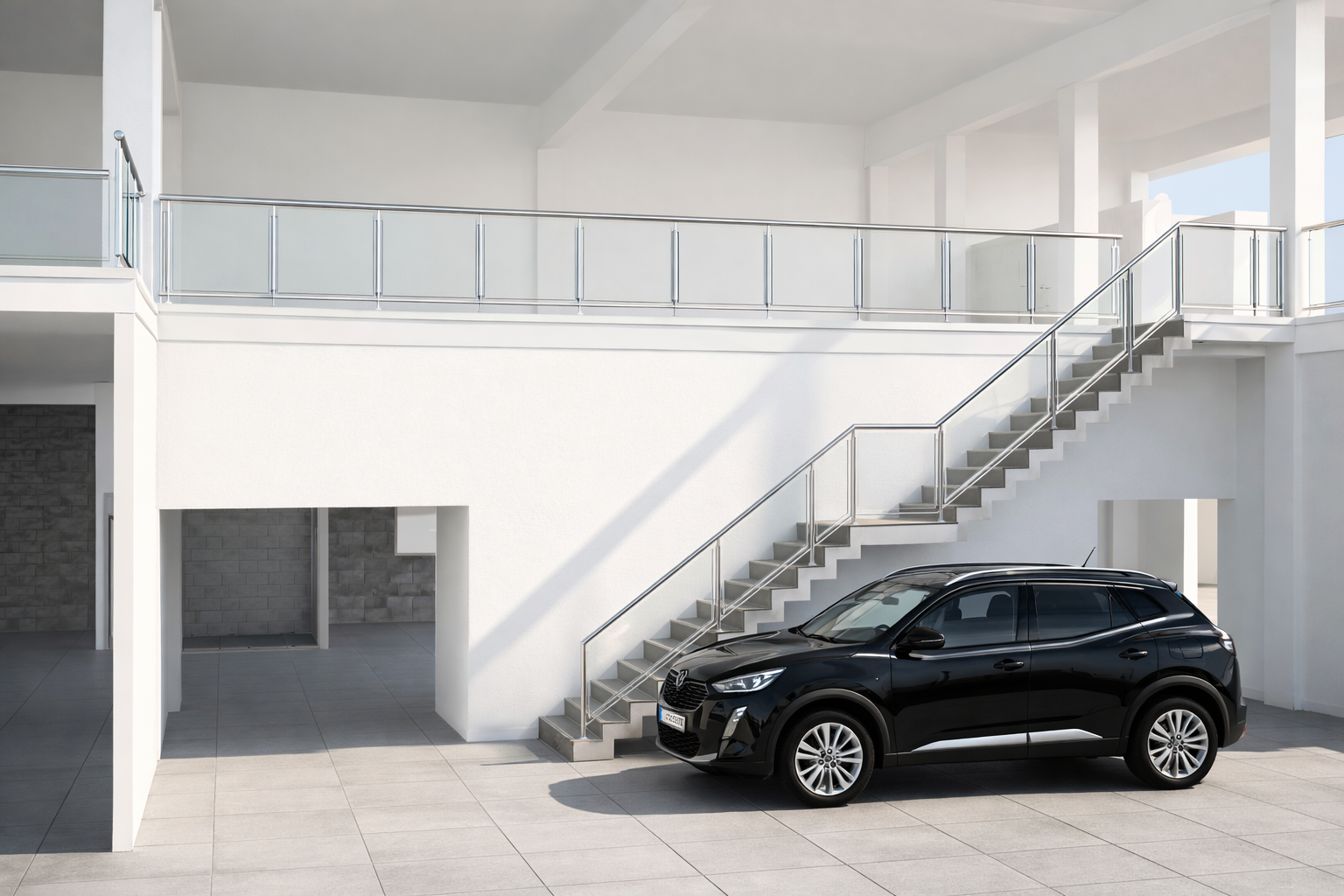 add characters keep the car add ceiling lights and pendant lights add two flower pots show the sky through the window lots of natural light add desks in the background nothing upstairs