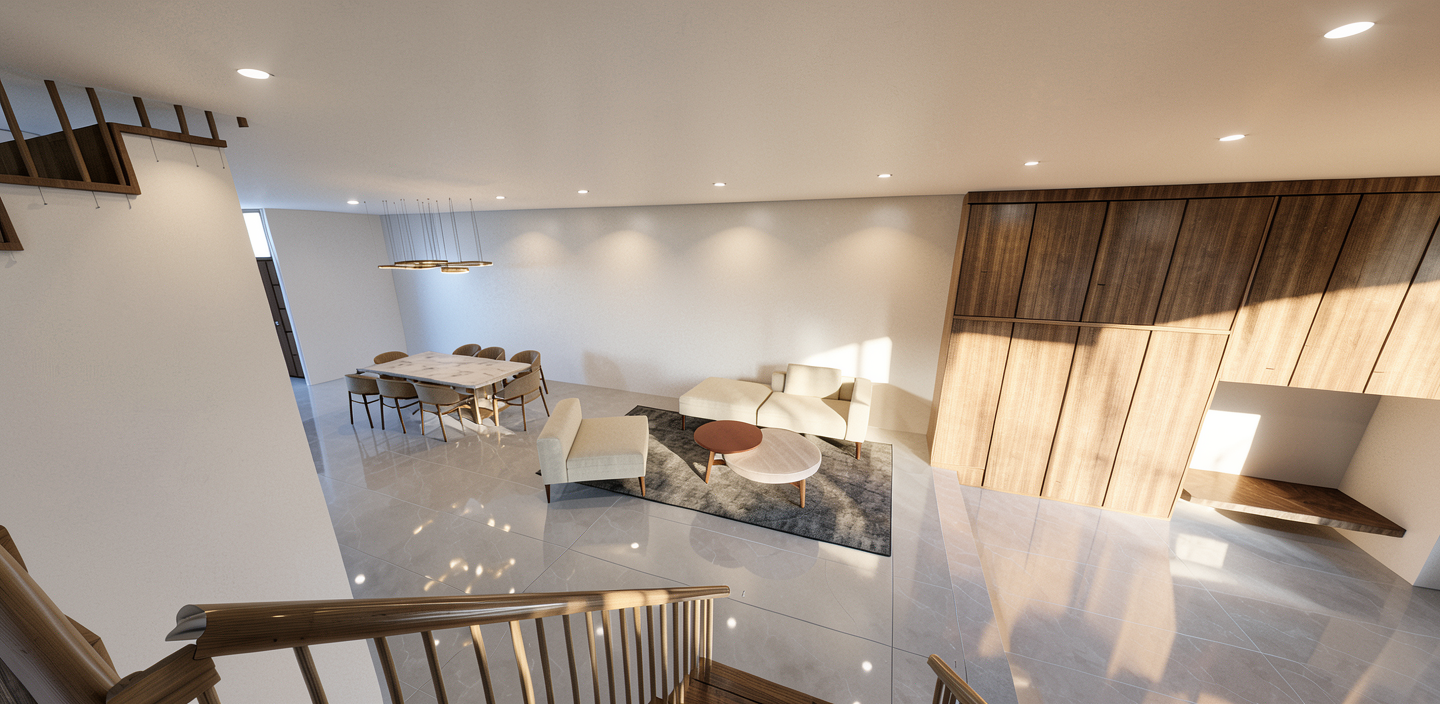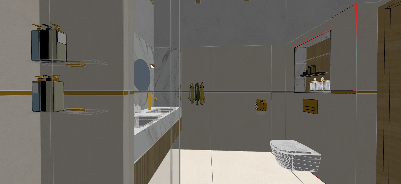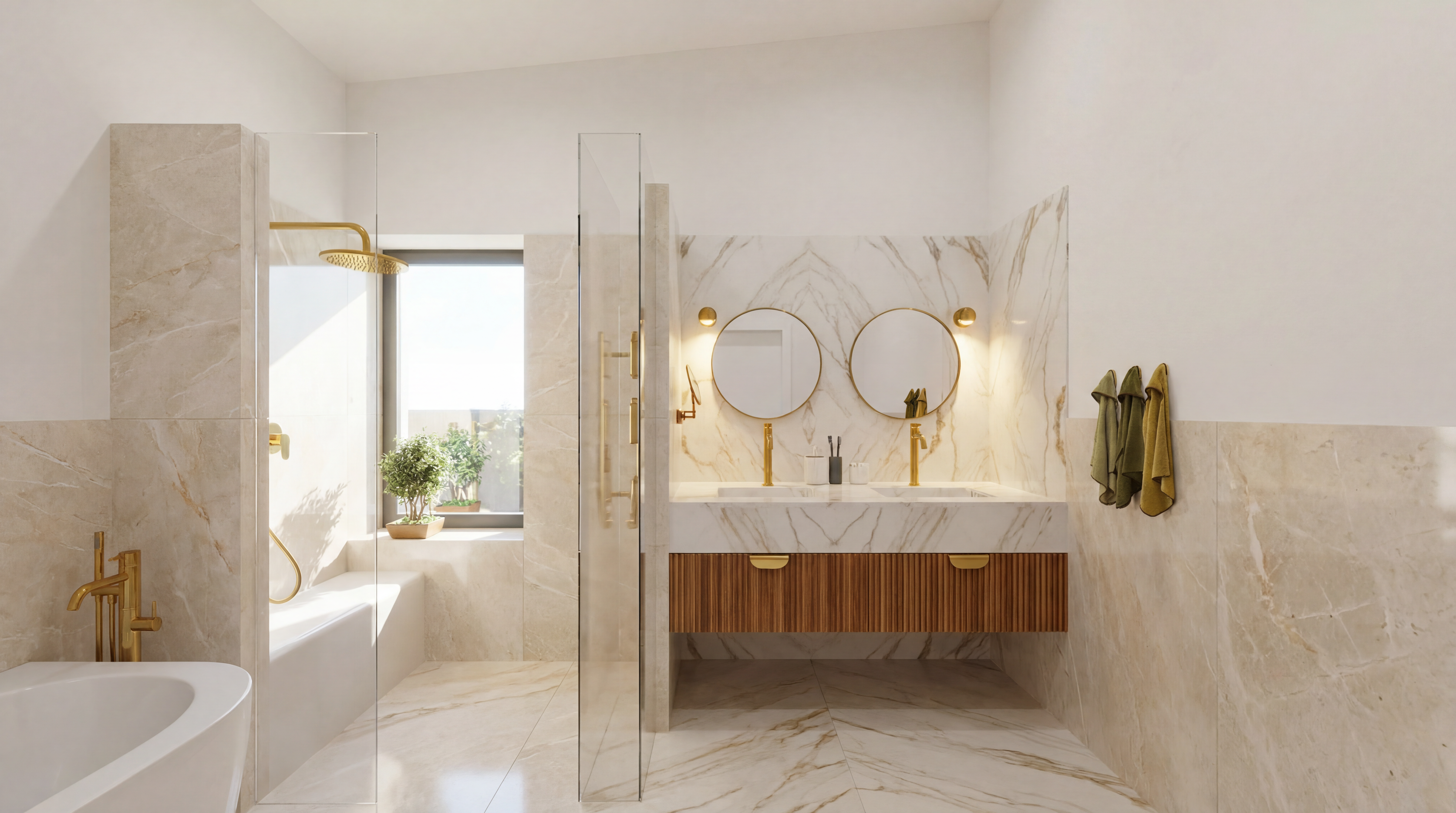 create a render in hyper realistic architectural visualization quality 8k resolution all objects furniture sanitary ware and architectural features must remain in place do not add any objects or delete anything from the image the spatial configuration must remain unchanged warmth gentle reflections soft shadows enhanced color richness and luxurious level realism improve depth and realism through wood grain richness brass highlights fabric texture and polished clarity while keeping the entire scene exactly as originally designed use downward facing light from the spherical wall lamp next to the round wall mirror use general daylight lighting in the room use a smooth white wall surface above the tiles the wall covering should be the same light color as the floor covering