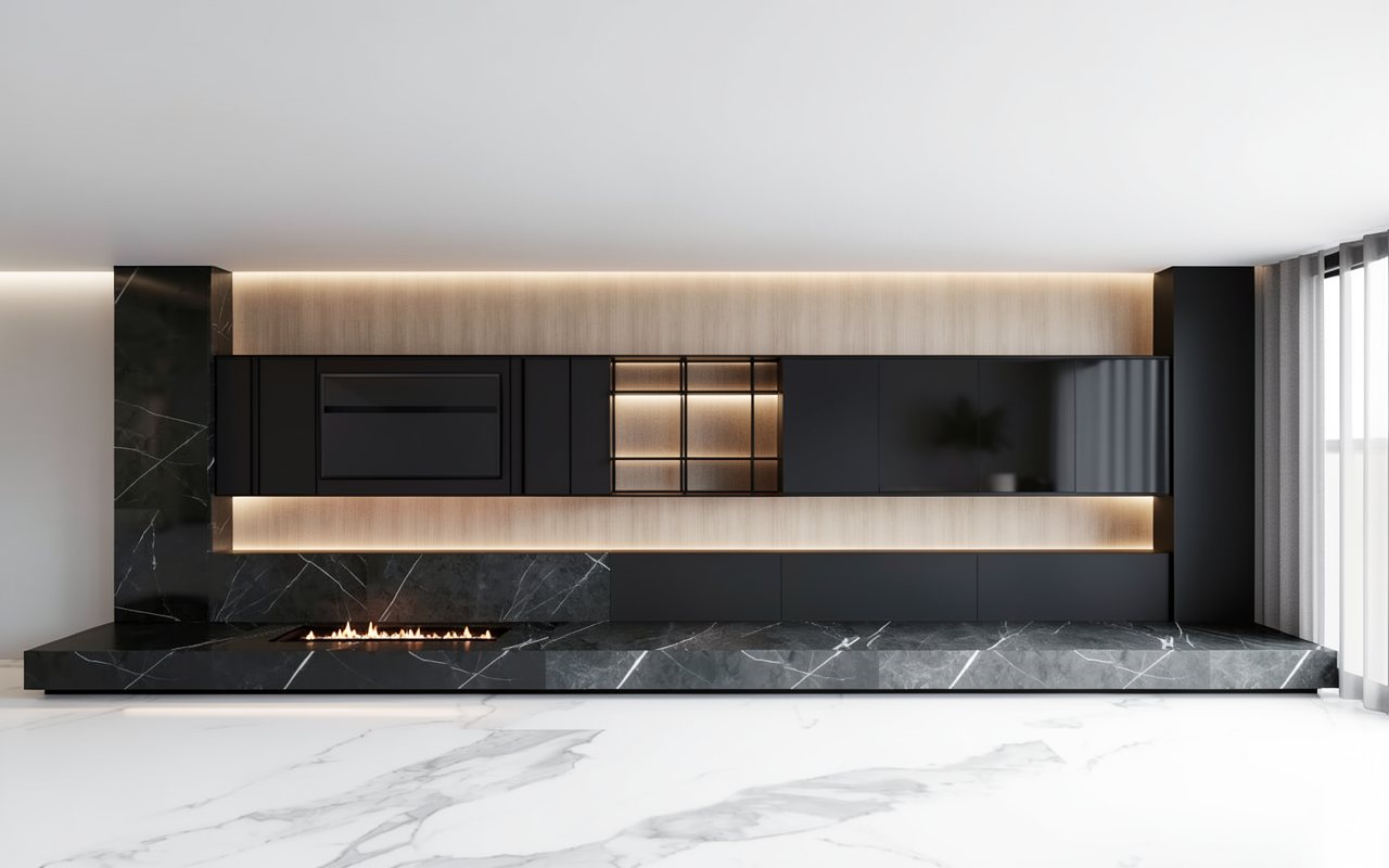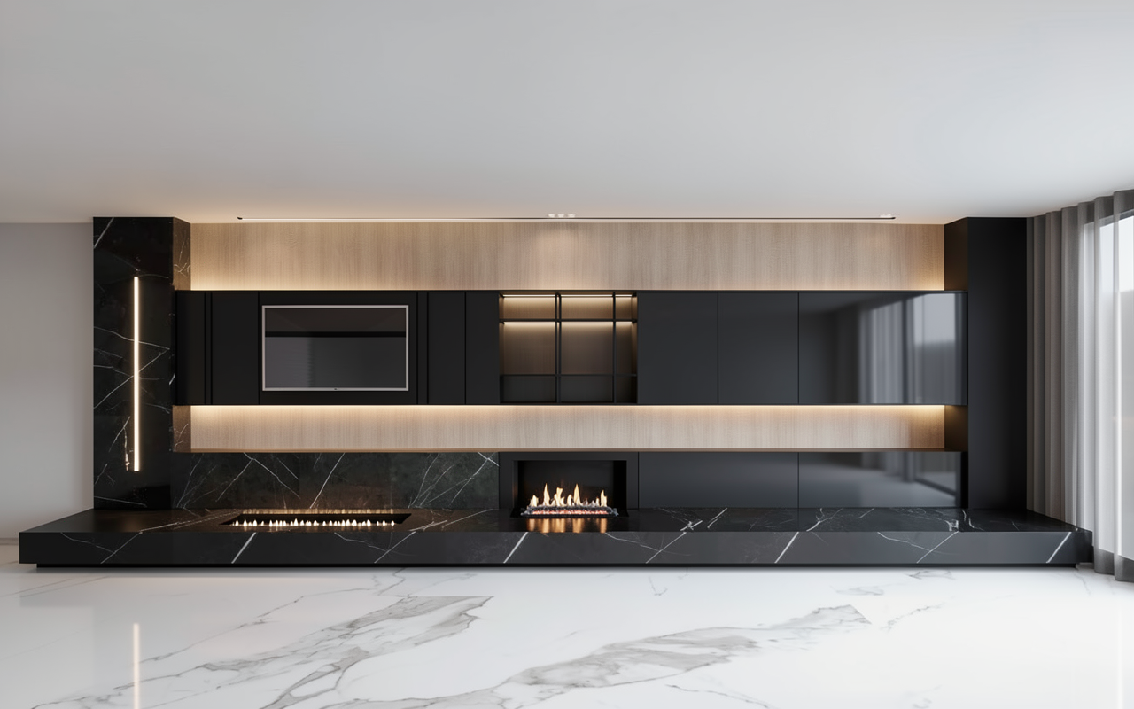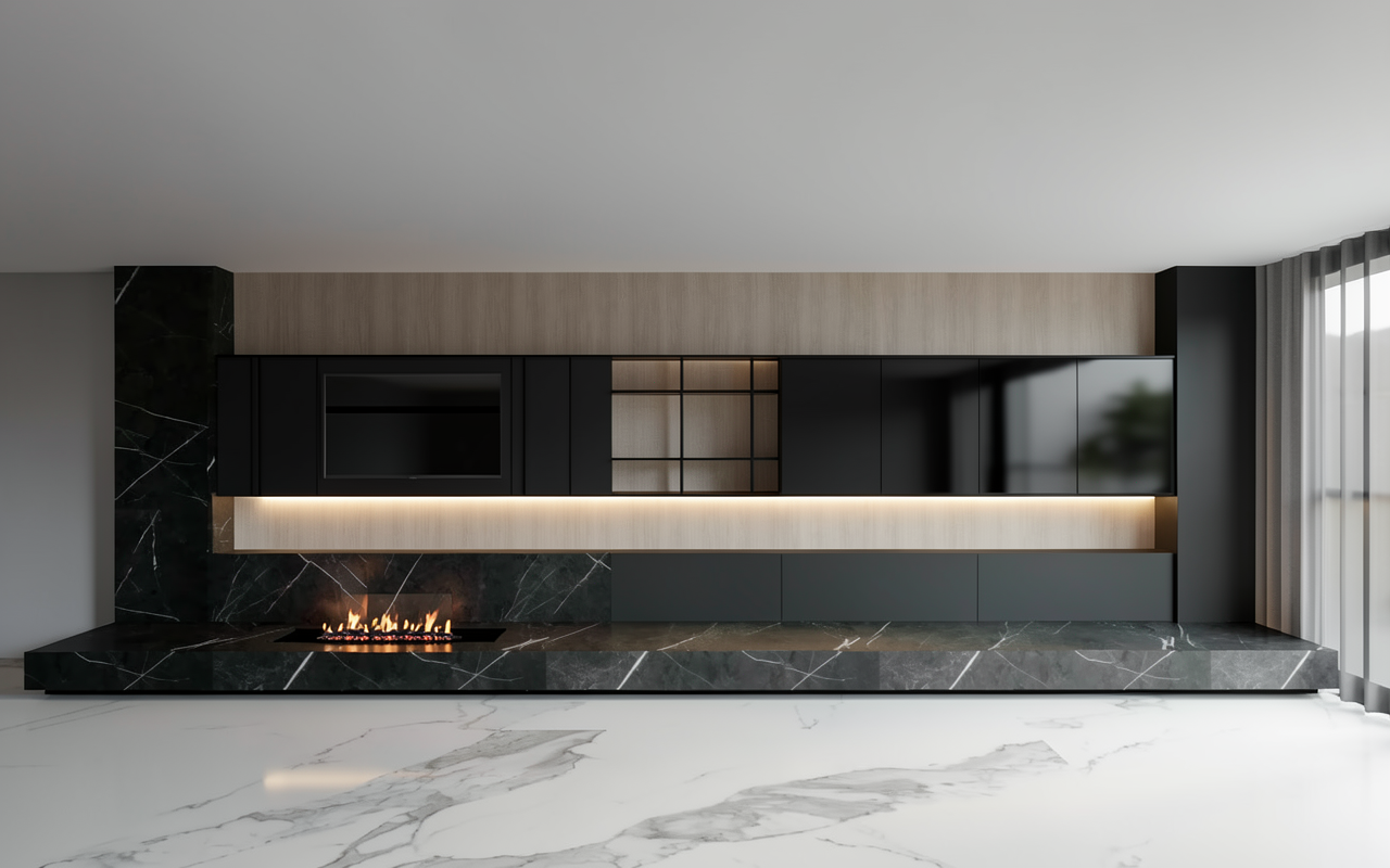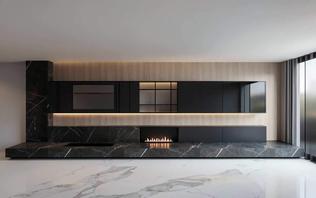 create a render in hyper realistic architectural visualization quality 8k resolution all objects furniture sanitary ware and architectural features must remain in place do not add any objects or delete anything from the image the spatial configuration must remain unchanged warmth gentle reflections soft shadows enhanced color richness and luxurious level realism improve depth and realism through wood grain richness brass highlights fabric texture and polished clarity while keeping the entire scene exactly as originally designed use downward facing light from the spherical wall lamp next to the round wall mirror use general daylight lighting in the room use a smooth white wall surface above the tiles the wall covering should be the same light color as the floor covering