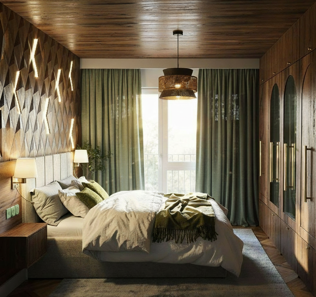 edit instruction change only the ceiling material to a deep matte dark green painted surface the ceiling should be solid dark green color slightly desaturated forest green matte paint finish subtle natural light reflections color deep desaturated forest green hex 314236 important keep everything else exactly the same as in the original image do not change walls wooden wall panels wardrobe bed bedding lamps furniture textures proportions lighting direction daylight intensity camera position composition the ceiling geometry must remain exactly the same only the material changes from wood to dark green paint maintain realistic interior lighting soft daylight from the window natural shadows photorealistic interior render natural color balance no stylistic reinterpretation negative constraints no new objects no extra lights no color change in furniture no material change on walls no changes in wood panels no ceiling beams added no glossy ceiling no texture distortion