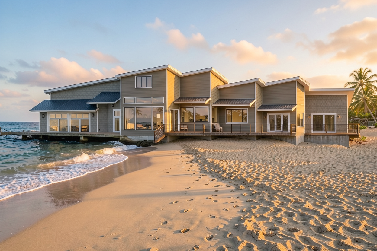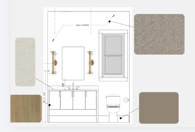 render this powder room elevation slab counter wood cabinets hardwood floor pendants flanking mirror wallpaper on walls and painted darker baseboard