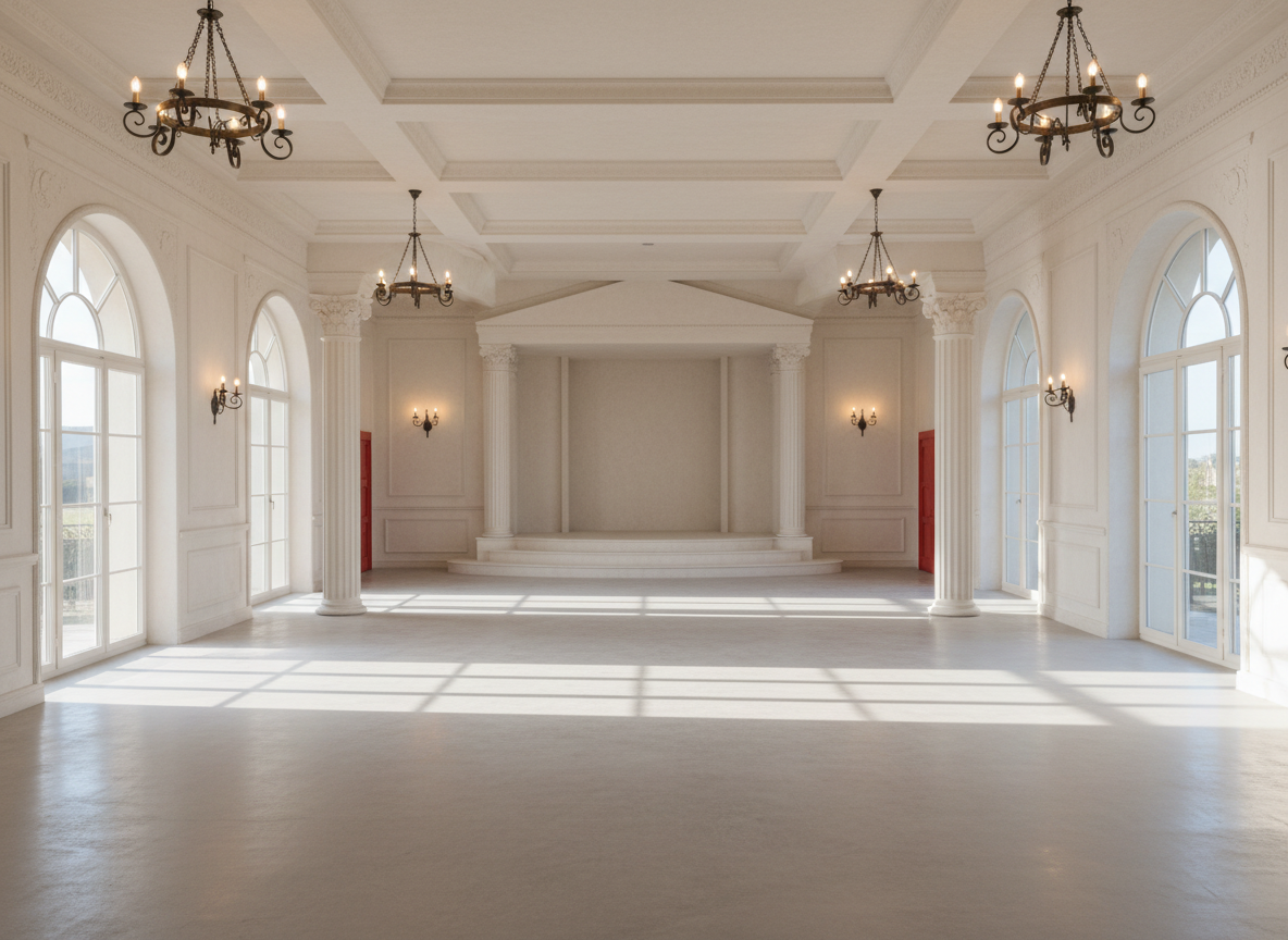 keep perspective as is event room no furniture small window on the far left and far right walls featuring an elegant stage with 3 steps atmospheric backlight the room lighted with elegant artificial light all finishes in neutral tones simliar to white alabaster