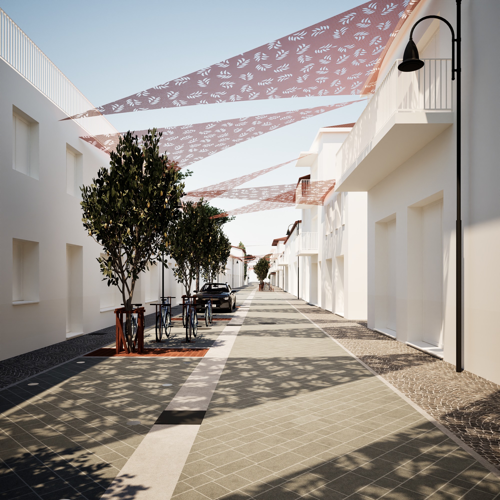 many people preople riding a bicicle add a parked car beetween the trees shot from behind so that the back is visible add a small edge to the sails