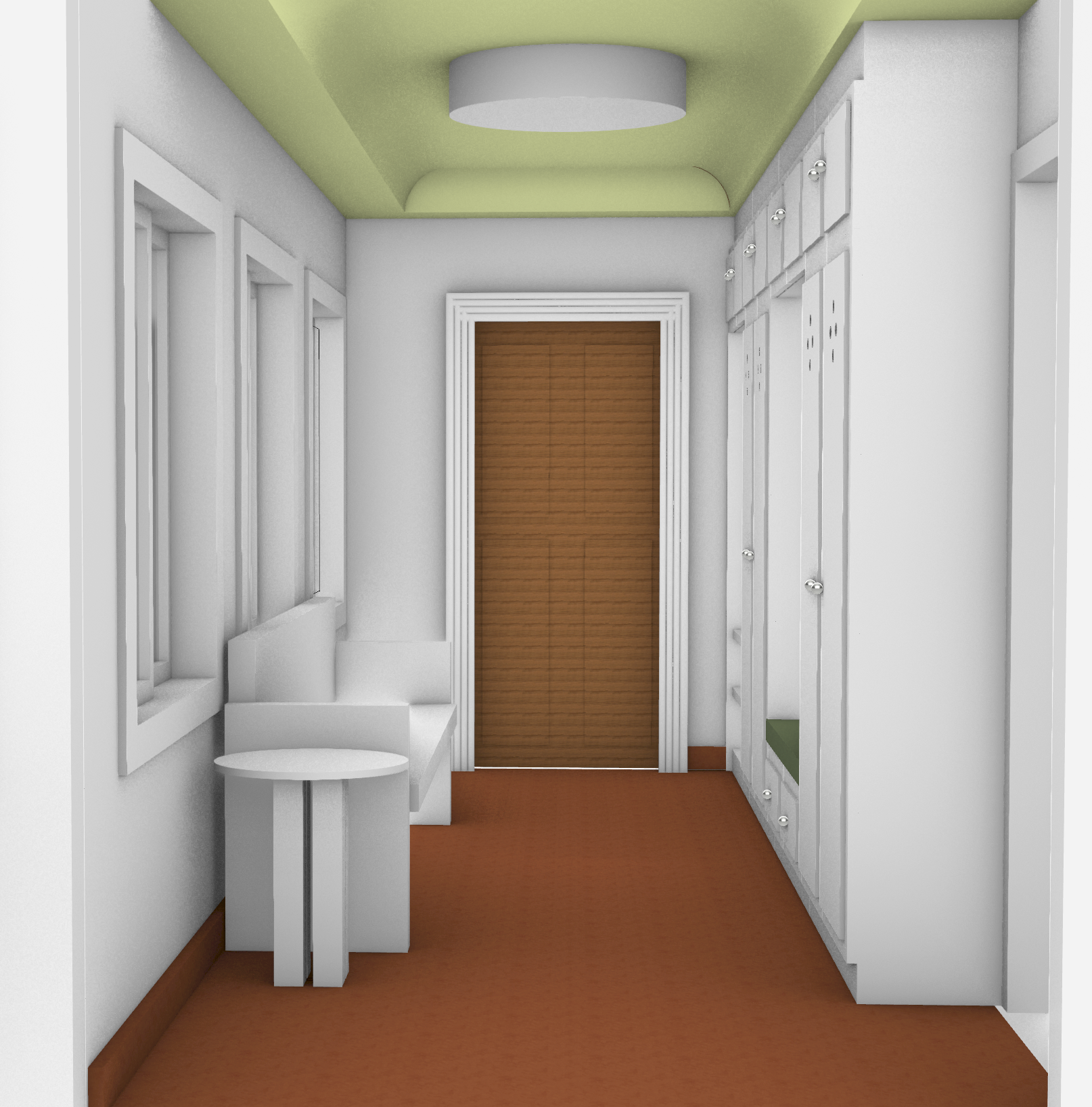render the room in a romantic morning light make the cabinets a light matte white with trim around the edges the floors and baseboard should be a matte brown brick rectangular tile in a grid pattern layout make the front door an eccentric detailed craftsman oak paneled door stained dark green the frame around the door can be black the walls can be off white the window frames and muntins can a dark stained wood with rich undertones the cylinder fixture on the ceiling should be off white make the ceiling a pastel lime green the bench on the left should be an old oak church pew add a side table next to it with some lavender from the garden