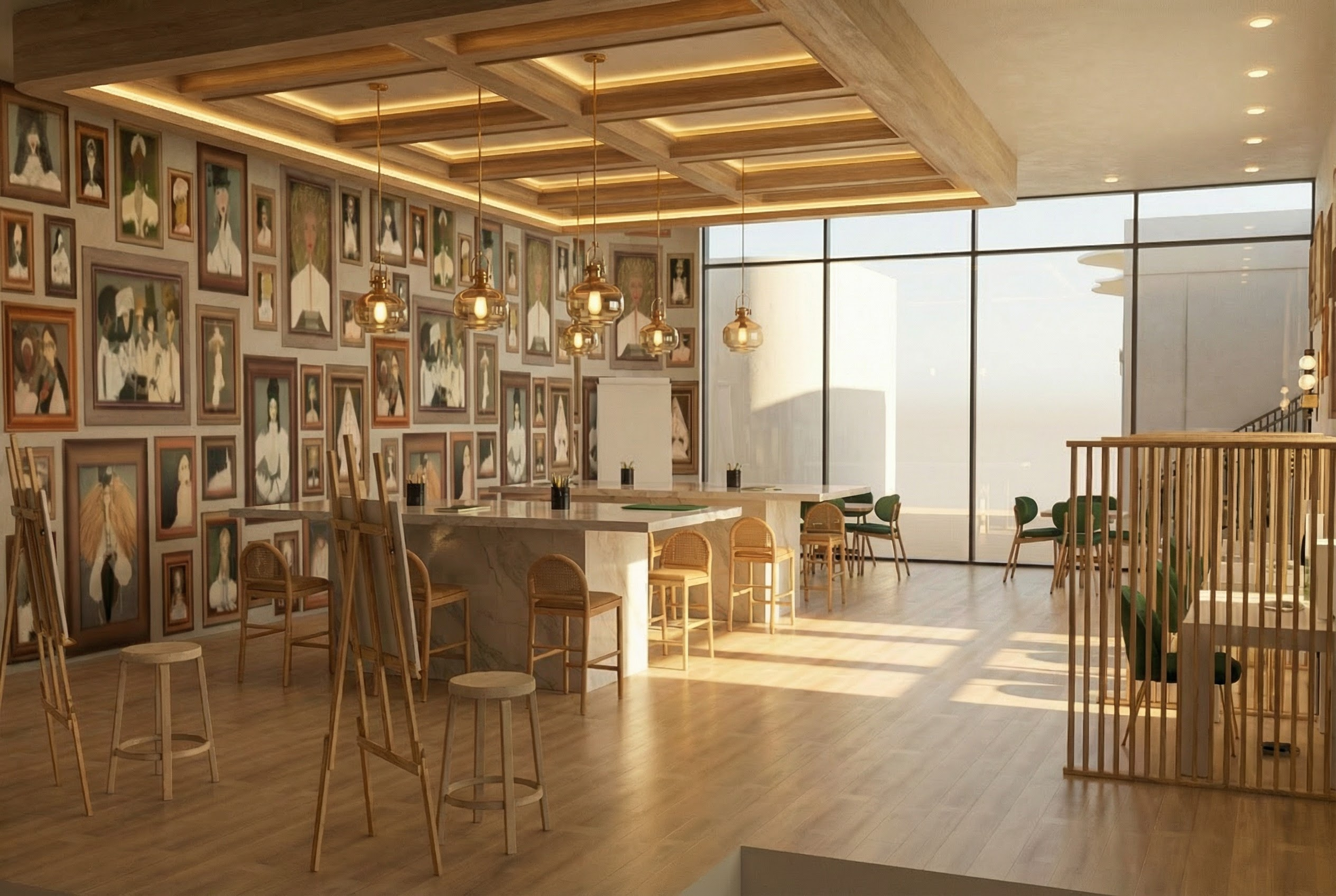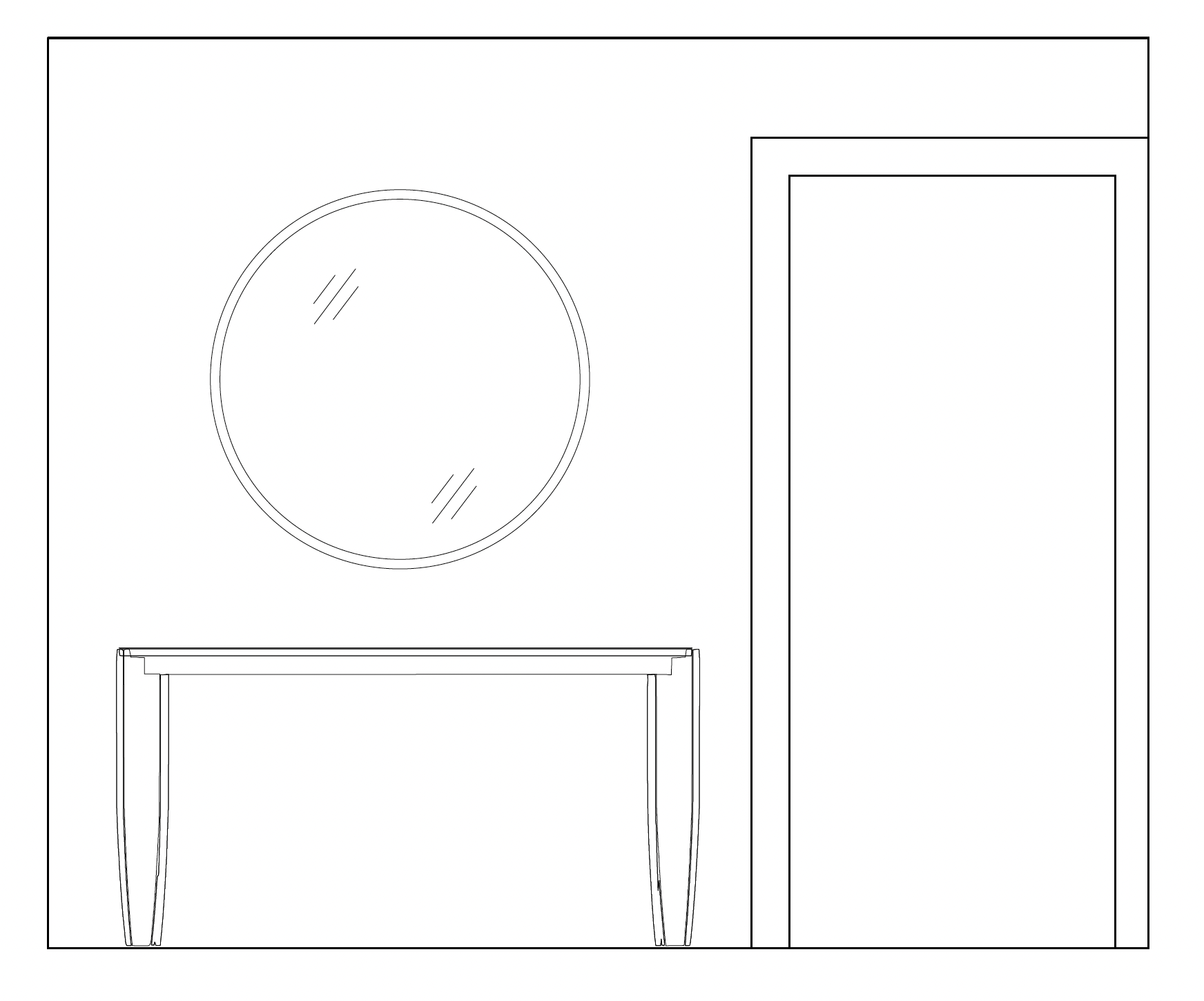 render this elevation with this console table and round mirror there is a doorway on the right open to a hallway