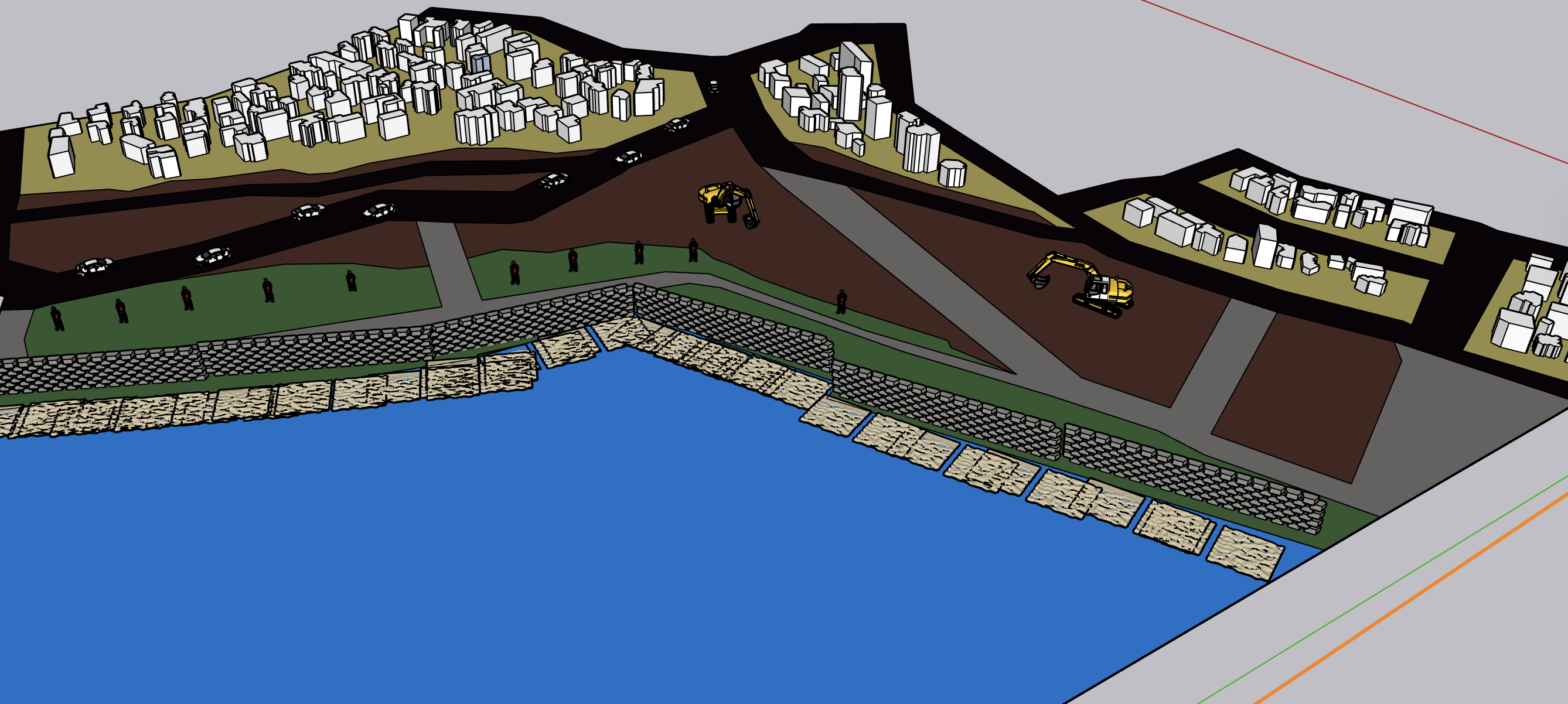 the yellow areas indicate residential zones the green areas represent the coastal restoration zone formed in response to shoreline processes the brown areas mark the government acquired demolition zone which functions as a walkable corridor during low tide the blue areas denote the ocean the area located behind the residential zone remains designated for residential use the area located behind the residential zone remains designated for residential use the area located behind the residential zone remains designated for residential use the grey are is decommissioned coastal road ghost line