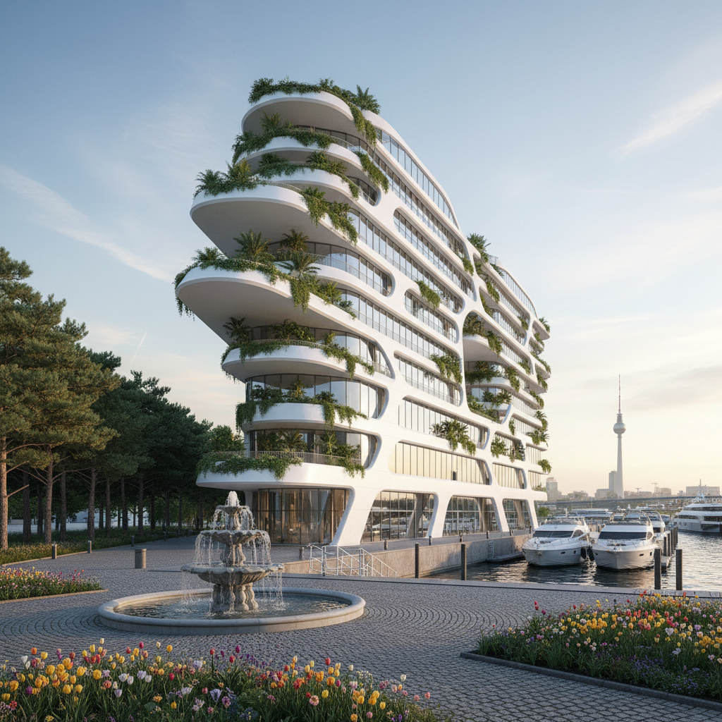 contemporary exterior shot a new 5 star hotel on the dock it uses an architectural language reminiscent of luxury yachting with the dominant color being white it features deep loggias and numerous overhanging balconies especially on the upper floors plenty of greenery perches on all floors architecture