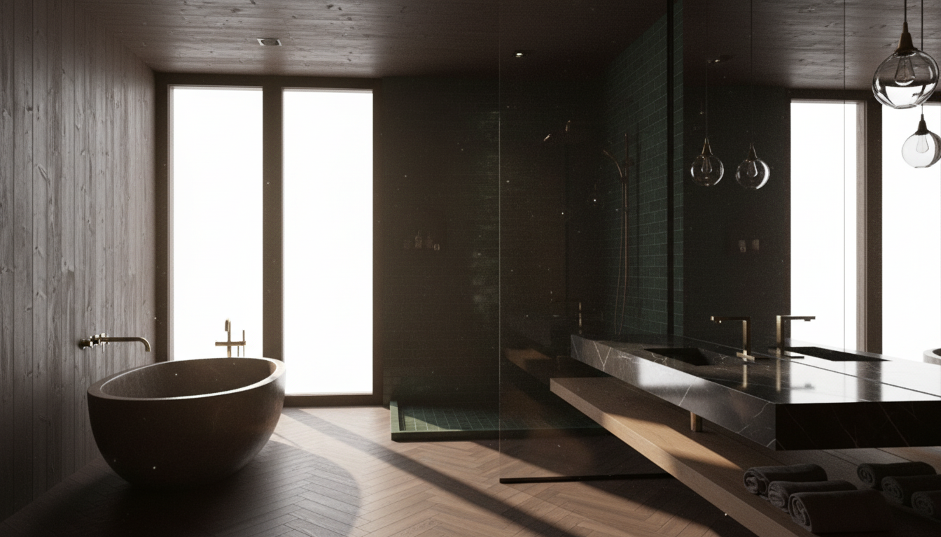 create a serene and luxurious bathroom scene based on the given layout the room dimensions are narrow approximately 11 x 6 design a modern japanese scandinavian bathroom from the pov of the entry on the right is the toilet followed by a minimalist walnut wood floating vanity with a sink sunk into it on either side of the mirror and handblown glass light fixtures in front of the viewer on the back wall is a fully enclosed shower area a dark green tiled spa steam shower the doors to the shower slide and seal to hold in steam on the left opposite the vanity include a dark brown stone freestanding oval bathtub on the left that sits directly on the floor include two small windows on the left above the tub that allow direct sunlight in use a color palette of neutral tones charcoal wood stone for a zen calming effect with matte brass fixtures the atmosphere should be peaceful and spa like inviting relaxation and tranquility no plants add dark walnut herringbone flooring try some new materials like sugi ban charred wood make it more rustic looking now make it narrower darker sexier and moodier keep everything the same and only change the windows to be larger but leave the windows in the same place above the tub