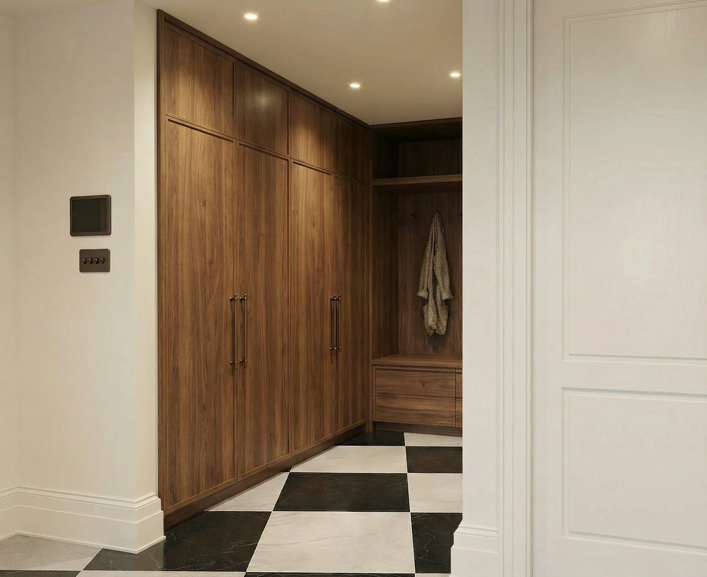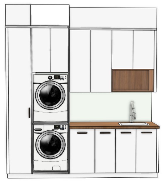 put downlights in the ceiling and natural light coming through to brighten the space add laundry decor and someone at the sink remove lines on bulkhead and make handles in a timber look to make benchtop colour