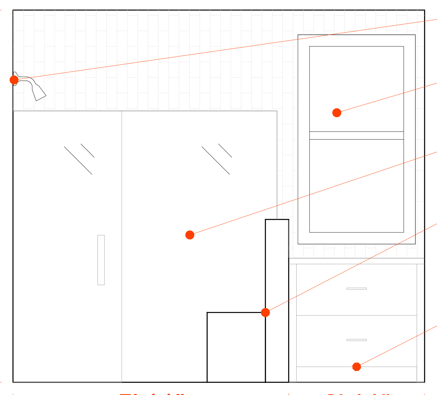 interior of a traditional bathroom tiled walls with glass shower door narrow window above off white cabinetry no faucet on cabinetry no mirror marble tile traditional floor maintain the scale of the drawing