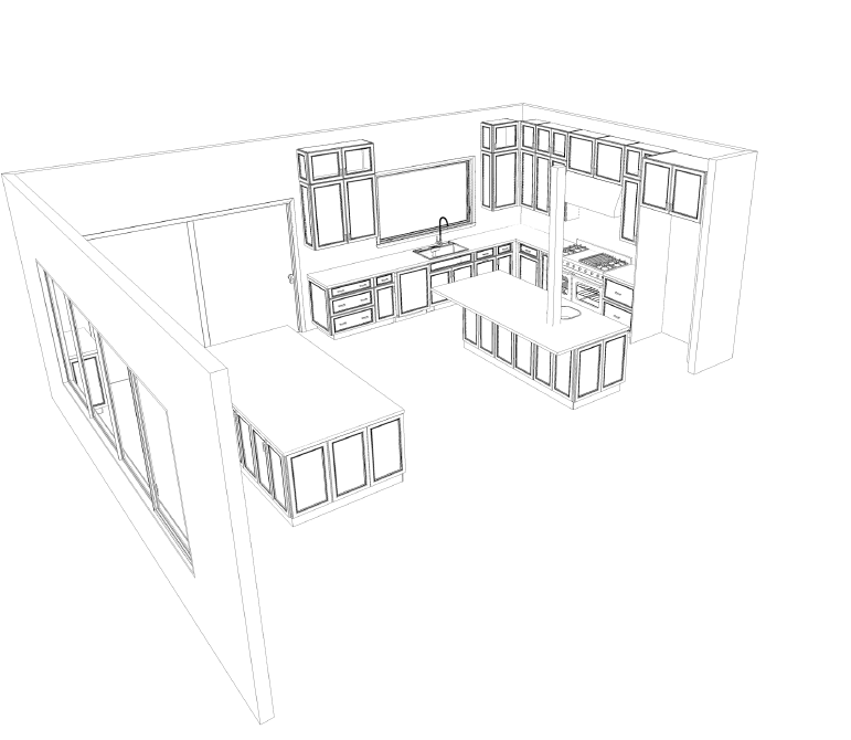 the perimeter cabinets and island on the right are maple white icing painted finish add crown to the top of the upper cabinets add fridge in the opening on the right of the perimeter cabinets island on the left is a maple painted celest finish add floors and countertop and tile back splash to match to kitchen style