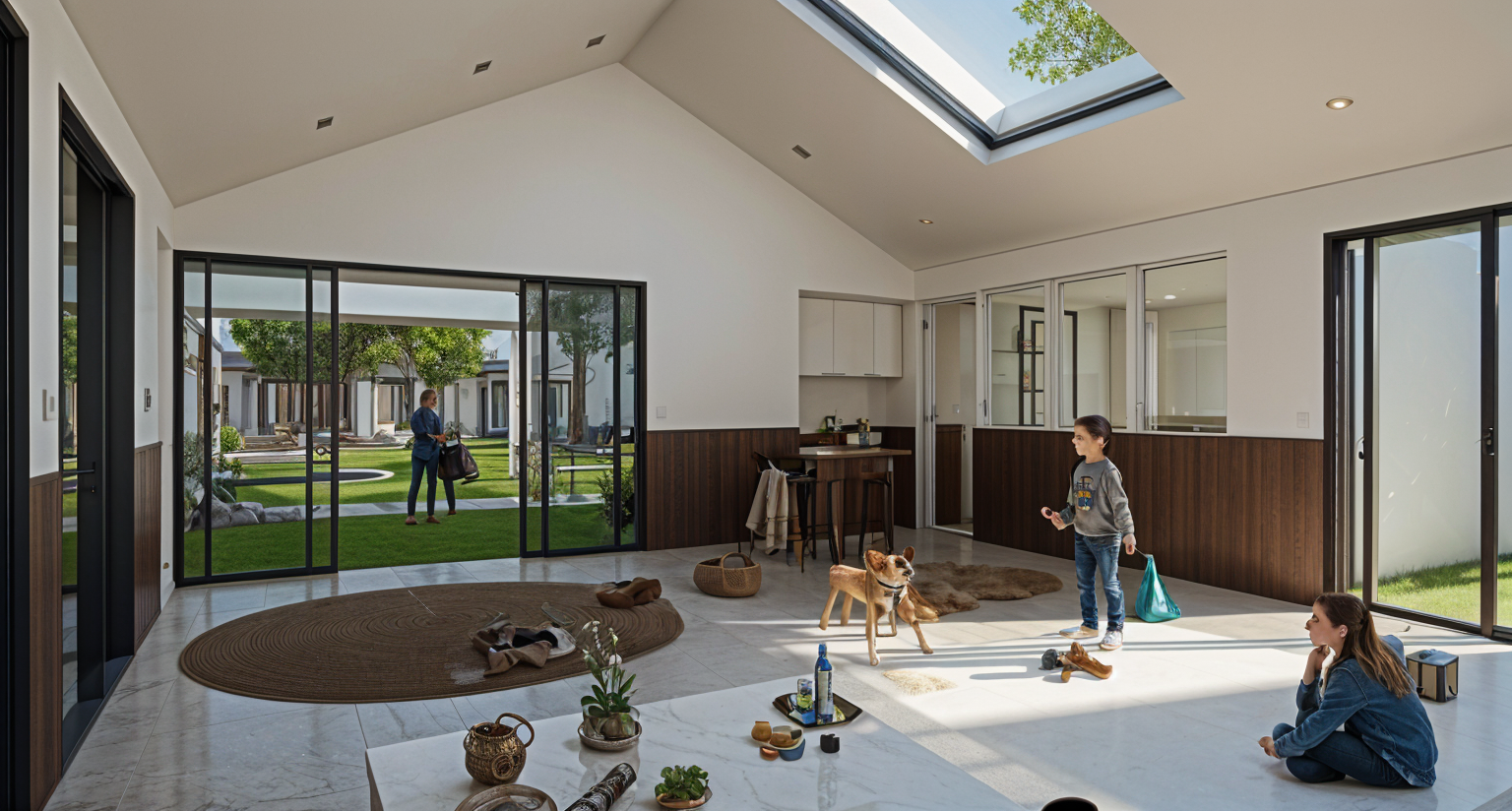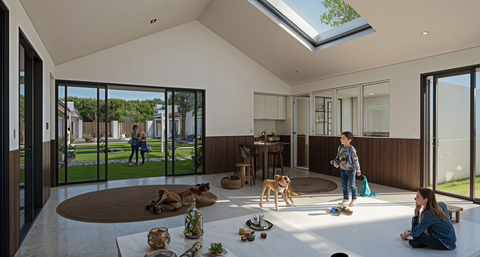 transform the existing scene into a warm and bright summer atmosphere without changing the architecture of the building keep the same volumes materials and proportions but add a soft golden light typical of a late summer afternoon integrate lush green vegetation leafy trees flowering shrubs and potted plants the sky should be clear and slightly golden with gentle shadows on the ground add a lively yet peaceful ambiance natural light reflections on the windows a few sun highlights on the fa ades all while preserving the architectural elements exactly as they are