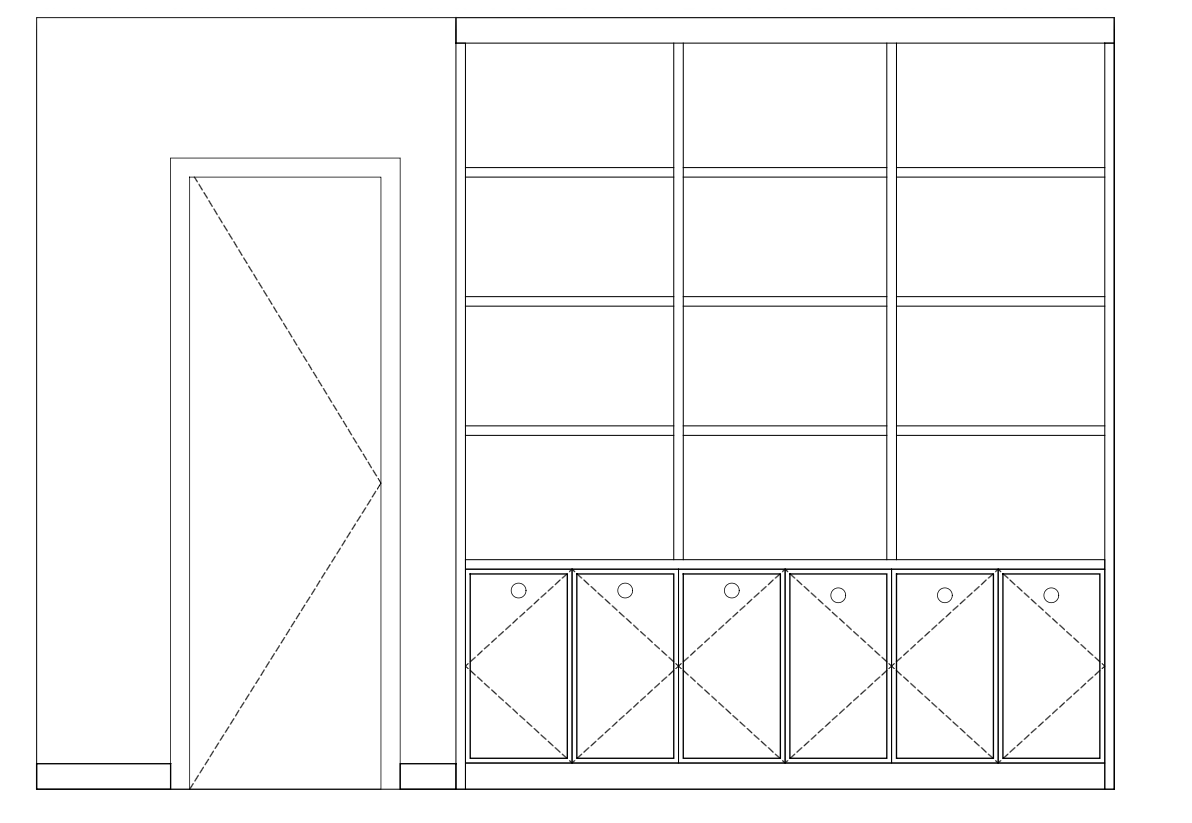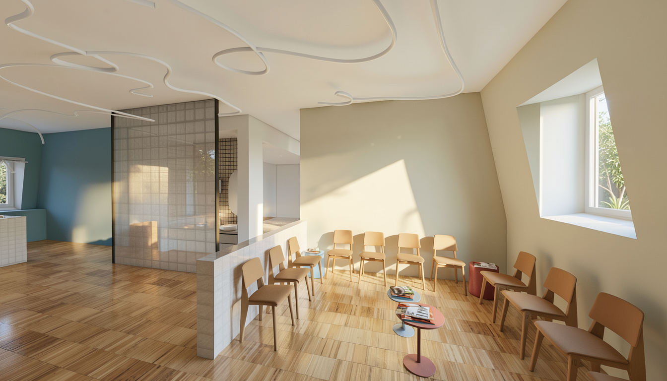 create a 3d interior render the bottom millwork cabinet is sherwin williams shade green and the vertical gables are wood