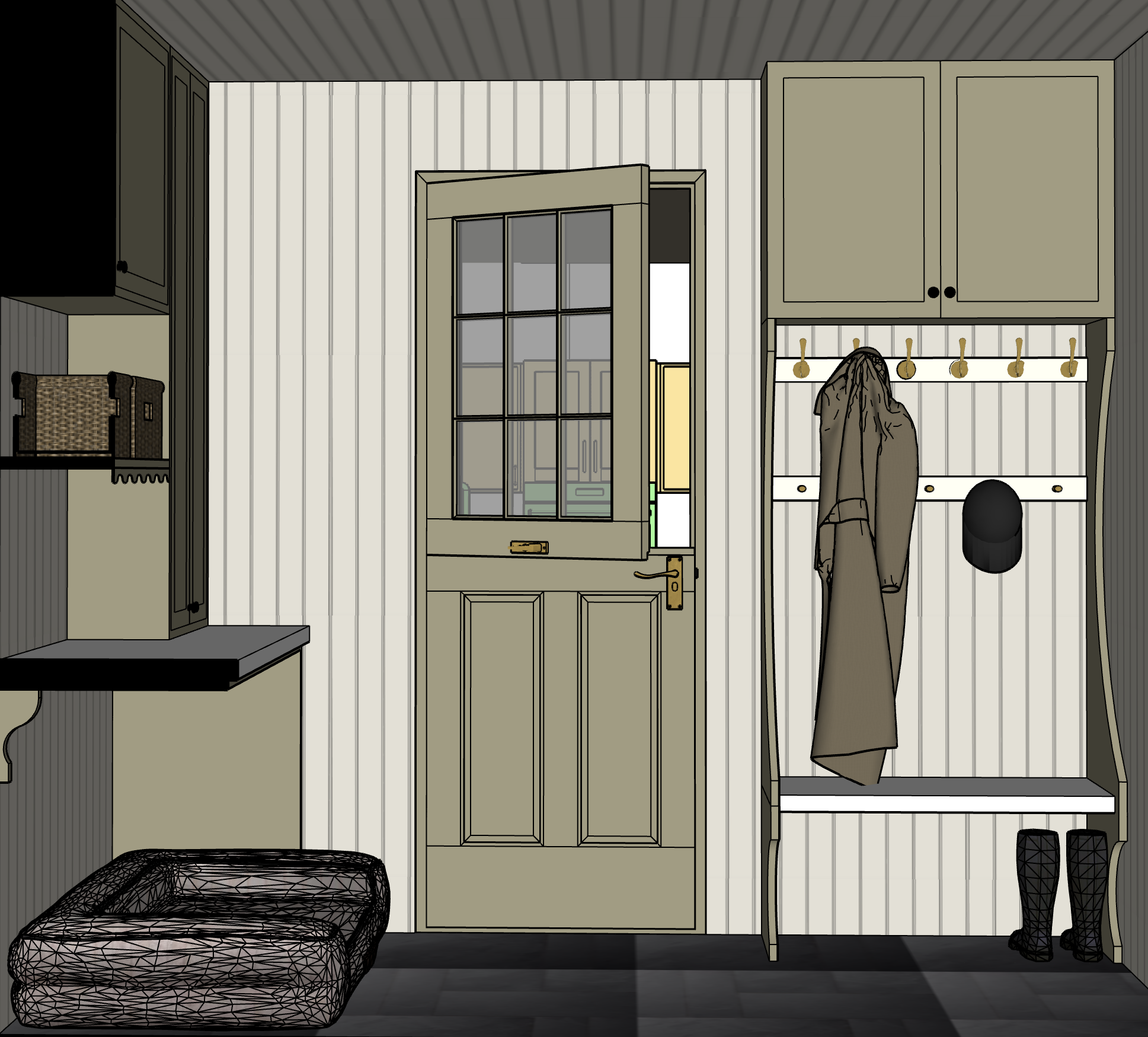 keep accurate colors and texture good lighting dog beds for a black lab is under the counter to the left behind the door is looking into a kitchen