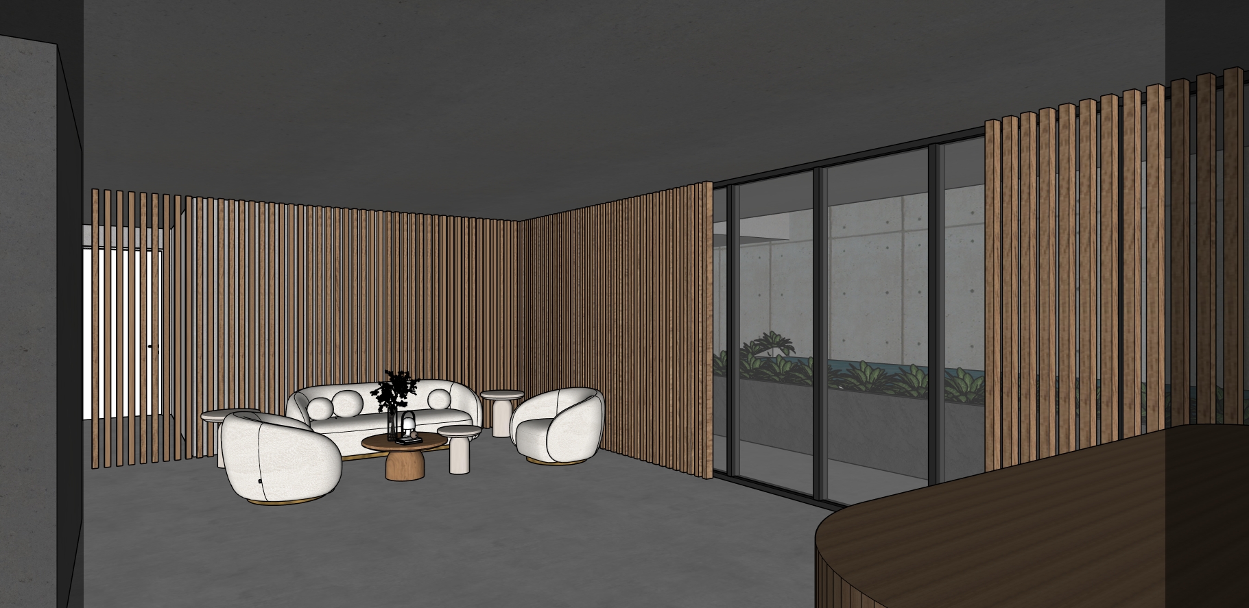its a building lobby with a pool on the back and a concrete wall the floor is grey porcelain and the wood paneling on the walls should touch the ceiling