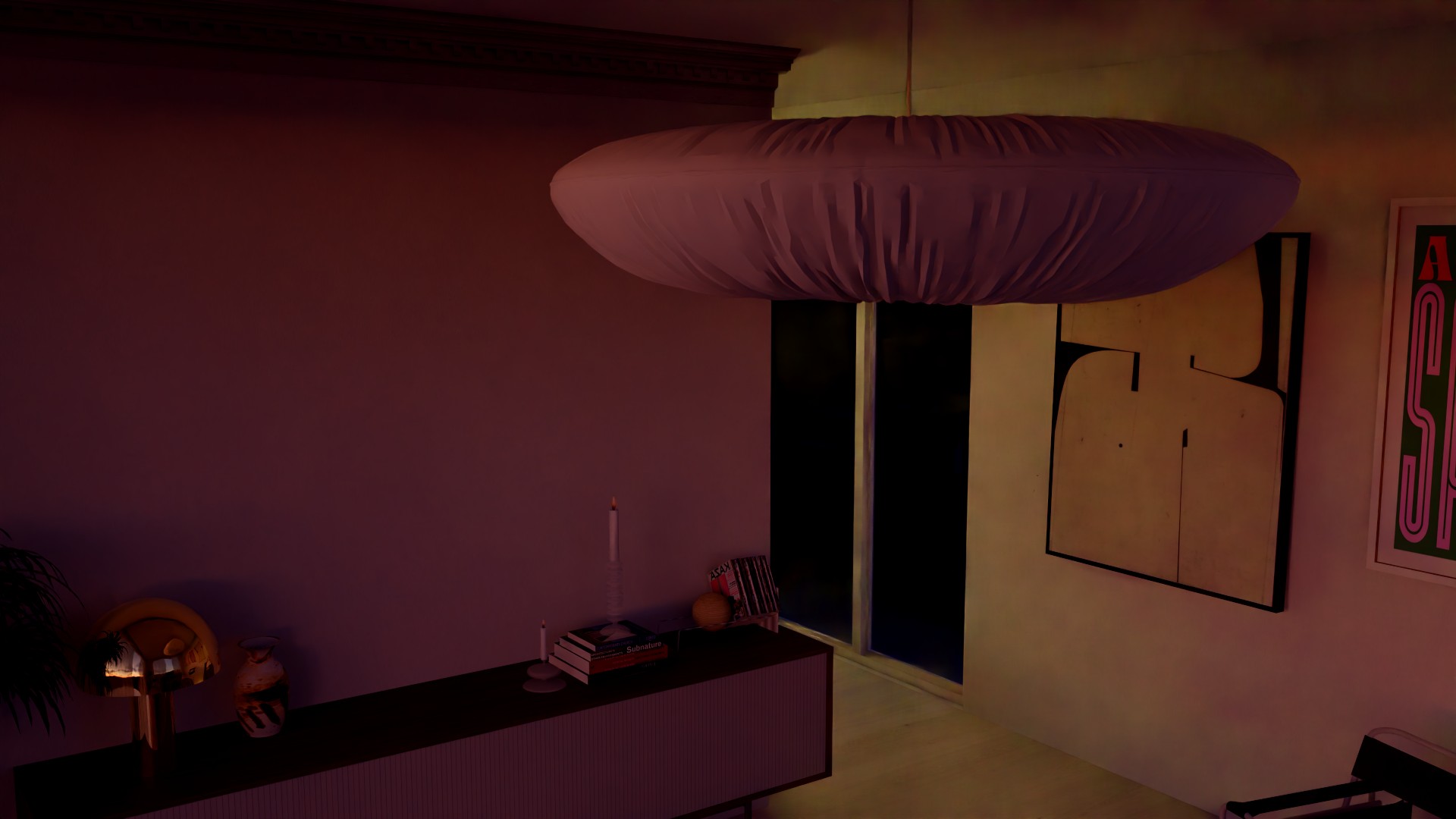 photorealistic interior scene based strictly on the provided image preserve all furniture artwork lighting fixtures console wall surfaces proportions and camera angle exactly as shown do not redesign or stylize any elements lighting primary focus fill the space with warm red amber and soft orange lighting creating a cozy evening atmosphere light should feel practical and indirect with gentle gradients natural falloff and subtle color blending across walls and ceiling avoid harsh contrast bloom or over saturation projected movie add a realistic projected movie image above the console on the wall projection should appear soft and slightly imperfect with mild keystone distortion subtle grain and gentle light spill around the edges blacks are not pure black whites are muted as in a real projector the projection should interact naturally with wall texture and existing artwork spacing environment realism light color spill reflects softly onto nearby surfaces slight noise and depth in darker areas no digital sharpness or graphic edges camera realism natural exposure balanced white point shifted warm minimal depth of field feels like a real nighttime interior photograph final output should feel intimate cinematic but real like a lived in room during a movie night not cgi not stylized not over processed