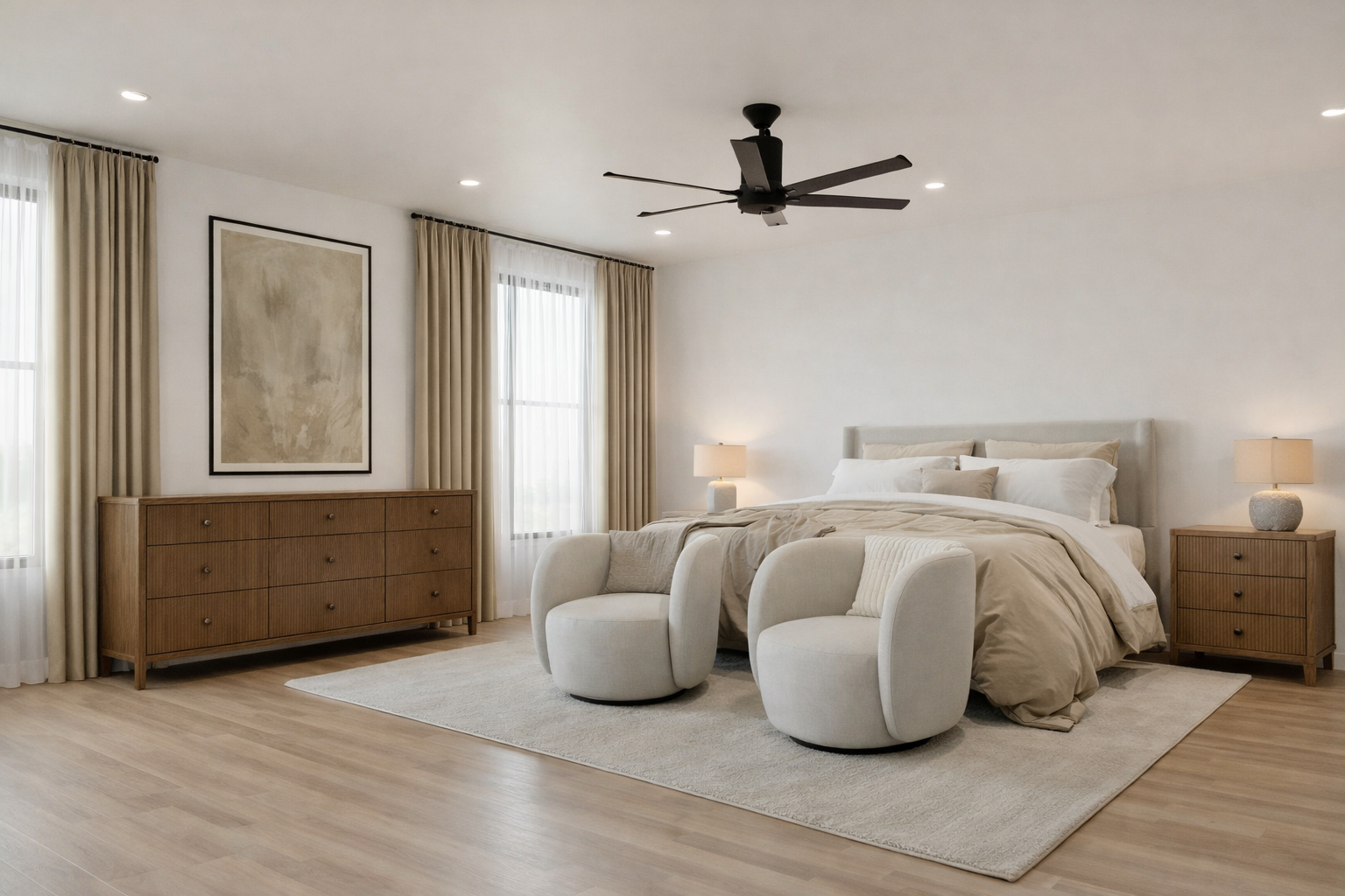 enhance this image to make the bed comforter and pillows appear full soft and highly realistic while maintaining the exact architecture layout furniture placement and materials shown in the original rendering do not change or move any furniture walls lighting or design elements only refine the bedding appearance the bed should feature a full plush comforter with natural volume and soft folds layered pillows that appear full structured and realistically arranged bedding that feels luxurious soft and inviting similar to high end hotel or restoration hardware styling the color palette should be neutral and calming including whites warm beiges soft cream tones fabrics should appear natural and high quality with subtle texture such as cotton or linen avoid flat or overly smooth surfaces the bedding should show realistic creasing drape and depth lighting should remain soft and natural allowing highlights and shadows to enhance the texture and volume of the bedding the final image should appear highly photorealistic warm and inviting with bedding that looks naturally styled and professionally photographed do not alter any other elements in the image only enhance the bedding realism and styling