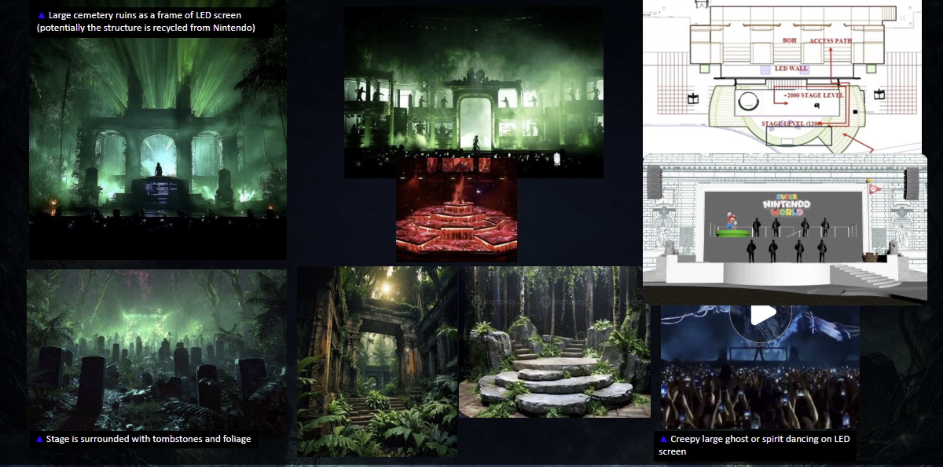 stone ruins and tombstone and lush planting laser beams and lighting shines