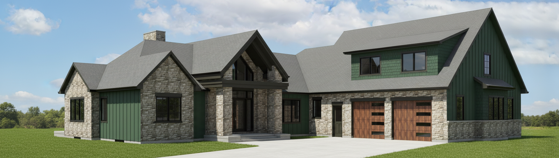 make rendering realistic with landscaping background trees stone to be realistic green siding and shakes to be lighter shade of green