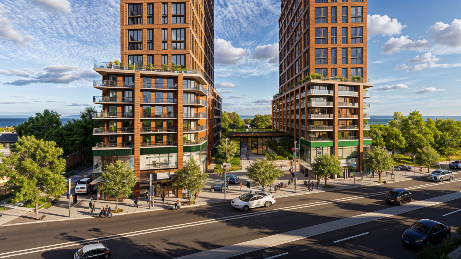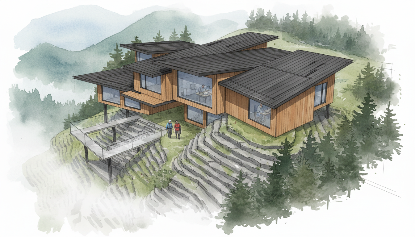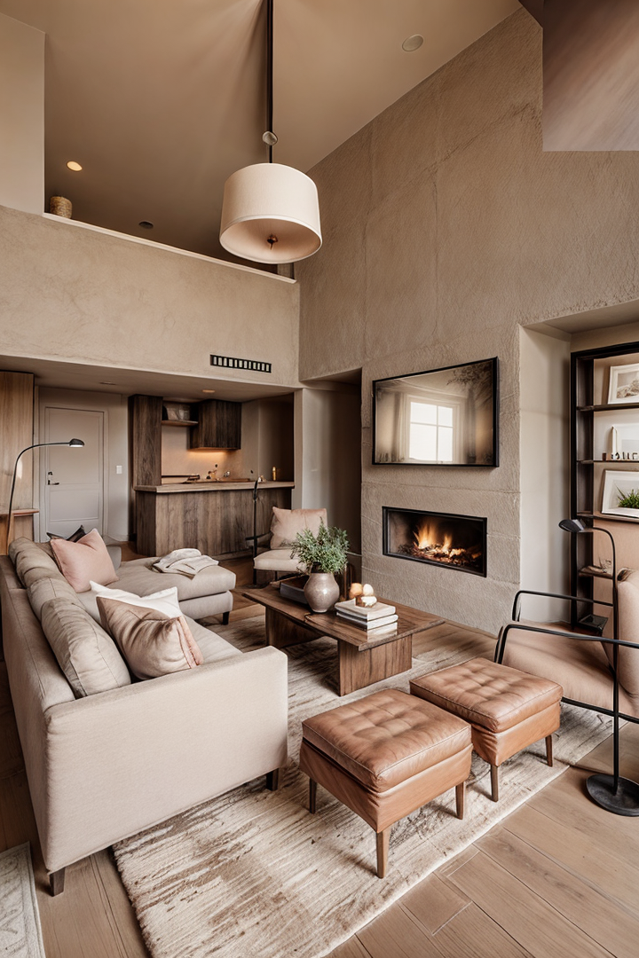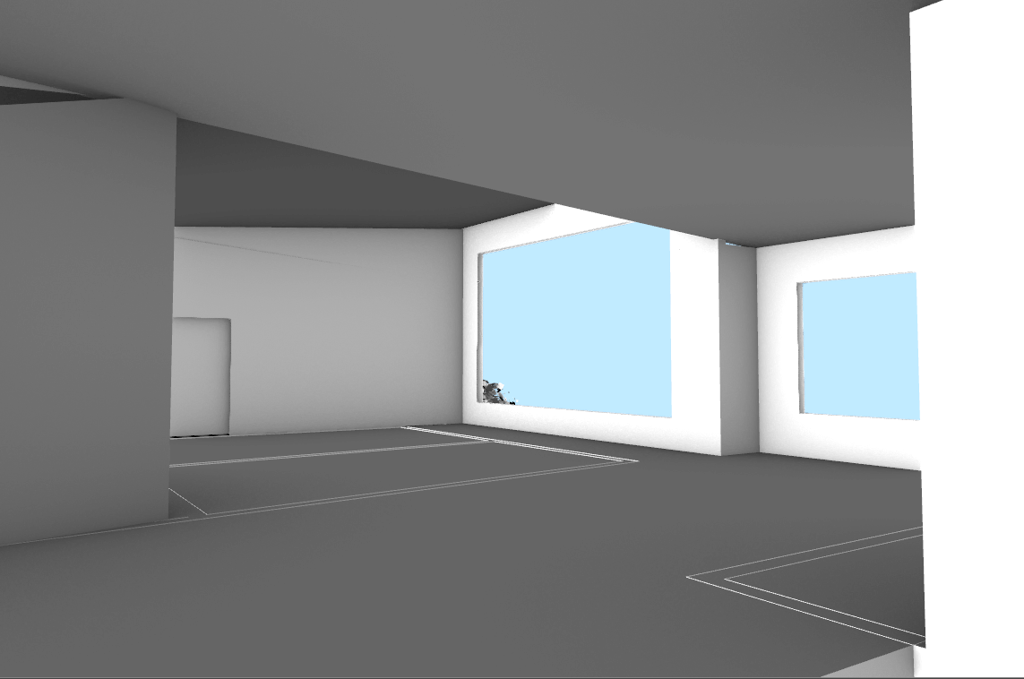 keep all existing geometry exactly the same render the interior as a bright modern space on the left side large window place a cozy living room with a sofa lounge chairs and a coffee table oriented toward the window on the right side smaller window design a minimalist kitchen with a centered island cabinets along the wall with the window and a nearby dining table with chairs maintain accurate lighting from the large windows with soft shadows render in a photoreal watercolor hybrid style realistic depth but with watercolor paper texture delicate brush edges and desaturated pastel tones