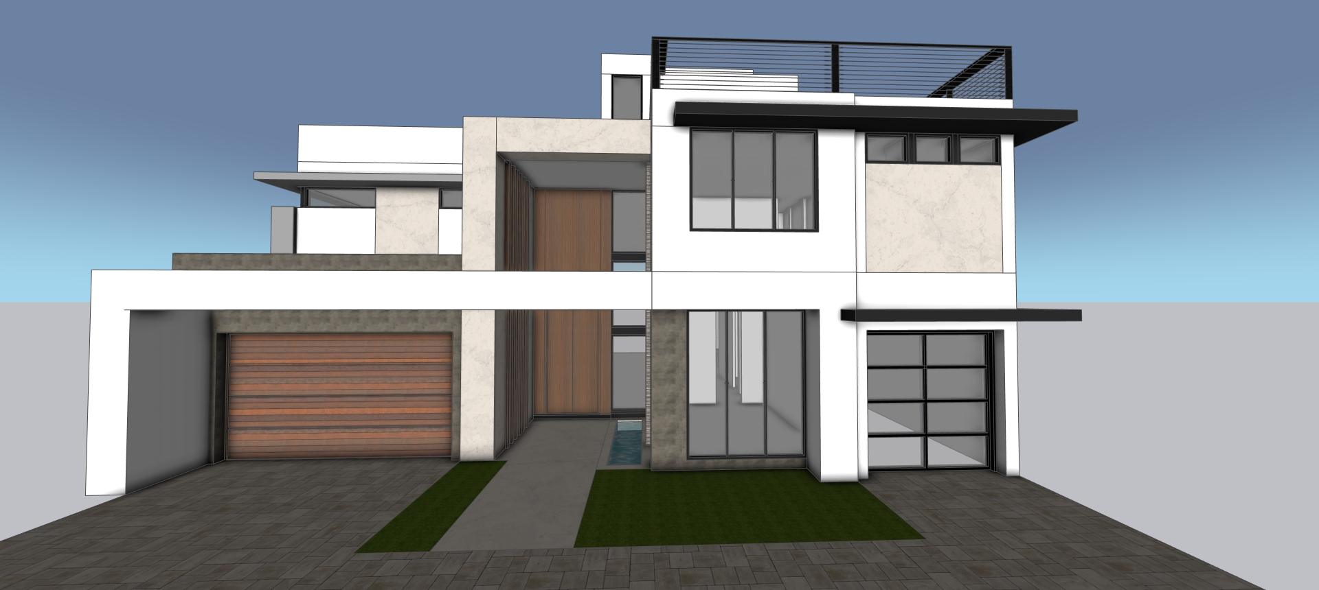 a modern luxurious house with clean geometric lines and a flat roof the facade is primarily white with soft beige stone accents giving a sleek minimalist appearance the large windows are framed in matte black adding a touch of elegance the garage door is a warm natural wood complementing the stone texture the driveway is a cool gray stone offering a contemporary look surrounding the house is a well manicured green lawn enhancing the welcoming atmosphere the sky is a clear serene blue creating a calm and peaceful ambiance