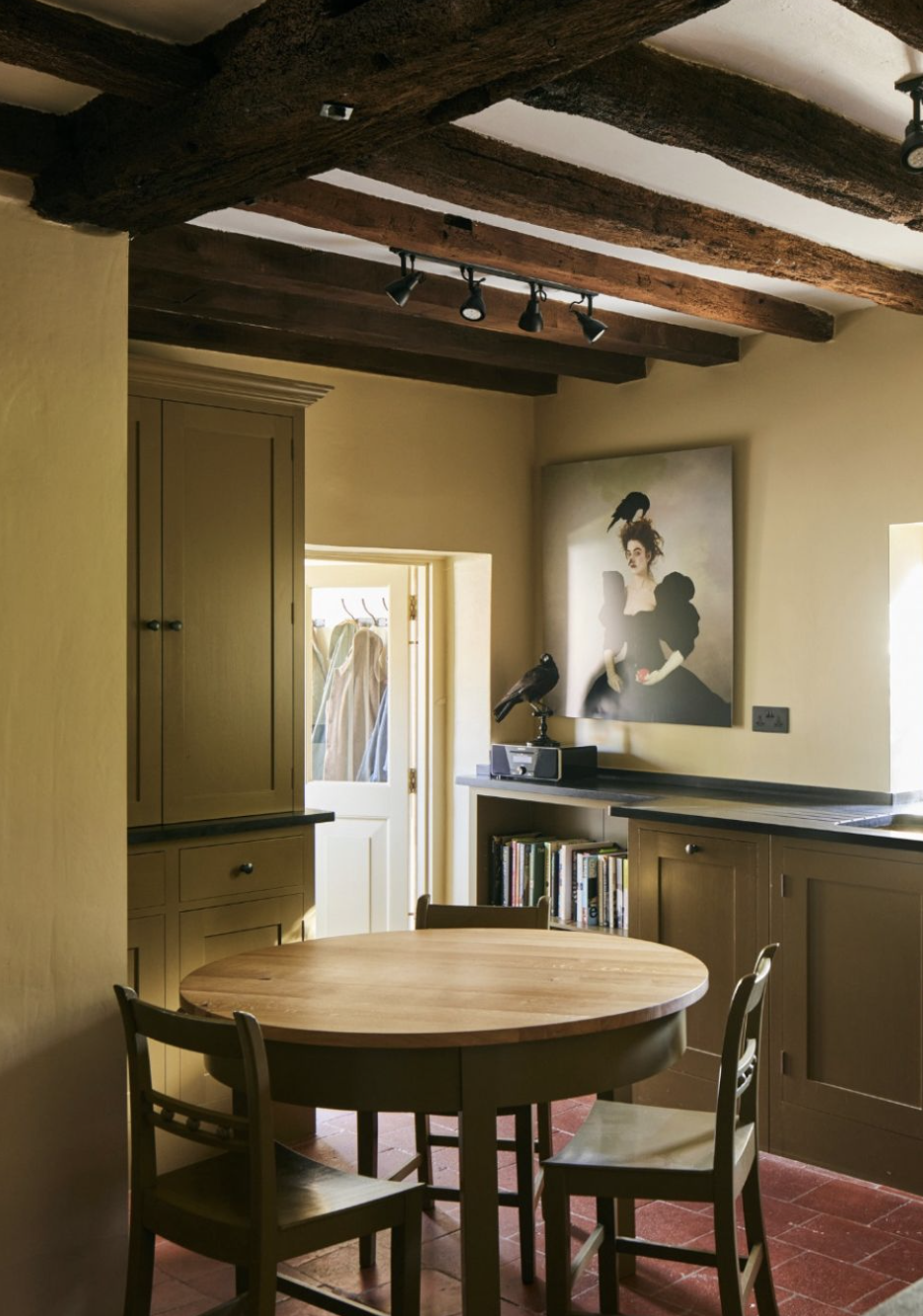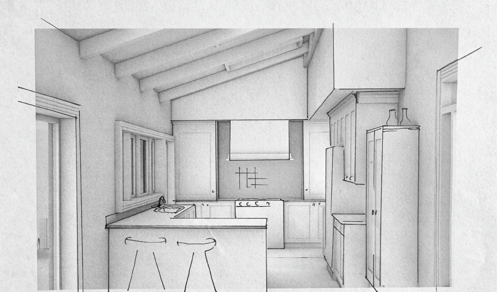 exterior shot there should be no black in the kitchen just dark wood extend the shiplap walls over the fume hood make the floors red brick