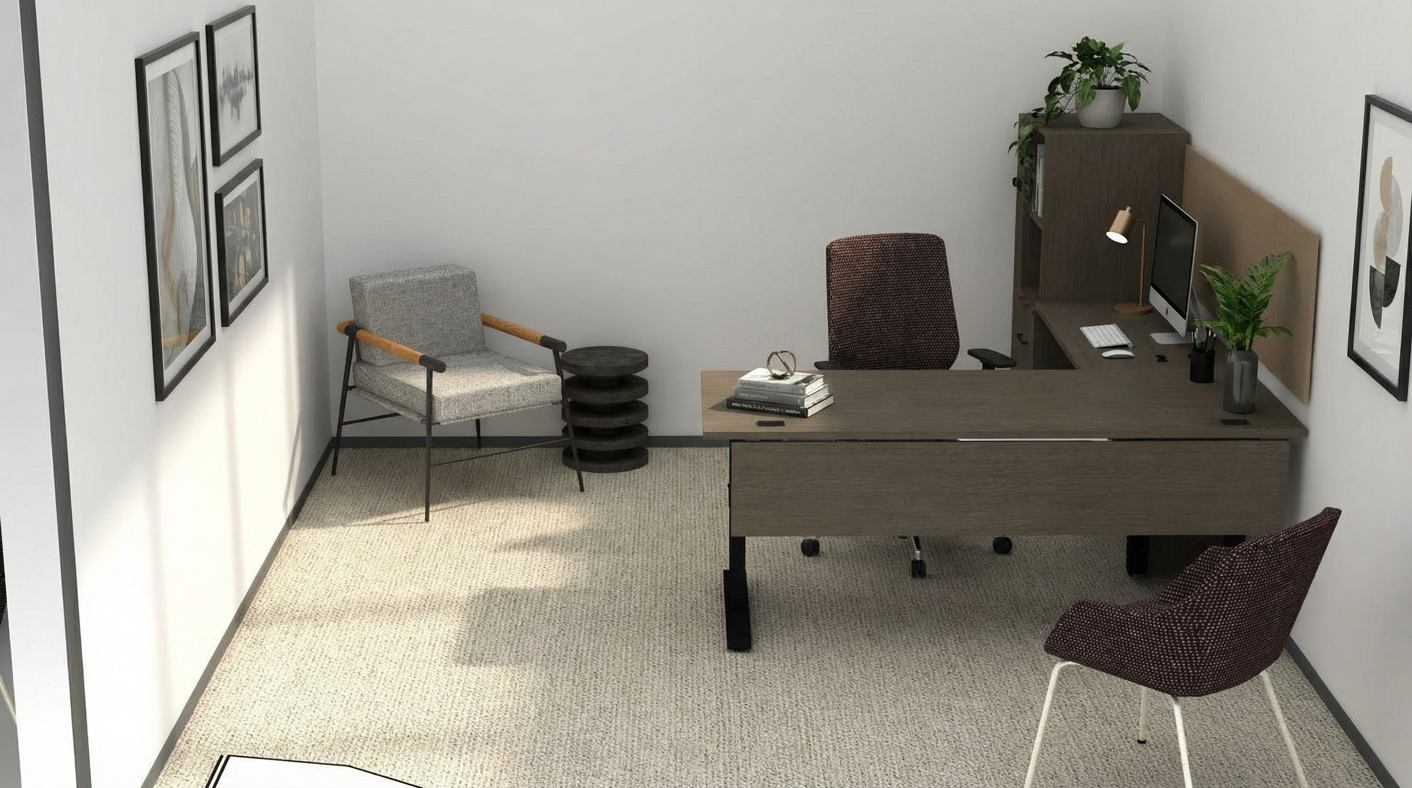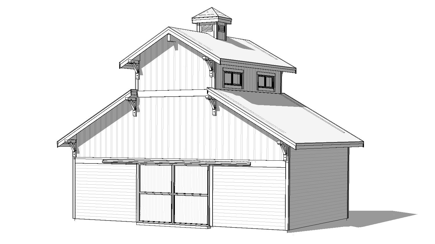 clean architectural exterior rendered in cinematic daylight lighting vertical cedar board batten wood siding on the top floor with horizontal cedar wood tongue groove siding on the lower floor cedar barn doors with black trim black metal standing seam roof high desert environment with light gravel in the foreground and bend oregon vegetation background clouds in the sky cinematic environment natural wood textures high fidelity photorealistic visualization crisp shadow falloff refined facade geometry richly detailed grain patterns soft atmospheric depth premium architectural photography mood ultra clean composition and materials