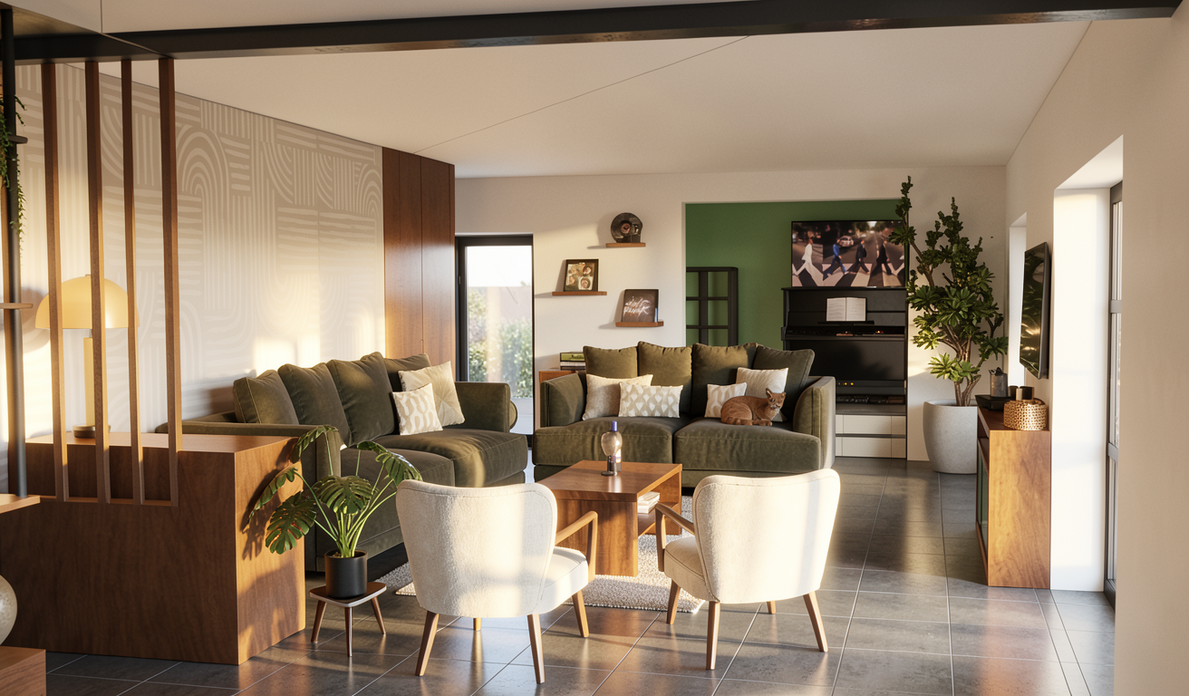 modern architecture light greige structurated rough concrete plaster facade evening matte coated titanium zinc roof in light greige natural oak main doors matte coated steel fence in light greige light grey beige aluminium windows photorealistic architectural visualization facade and ornamental grasses at the entrance illuminated by ground mounted spotlights greige garrage doors