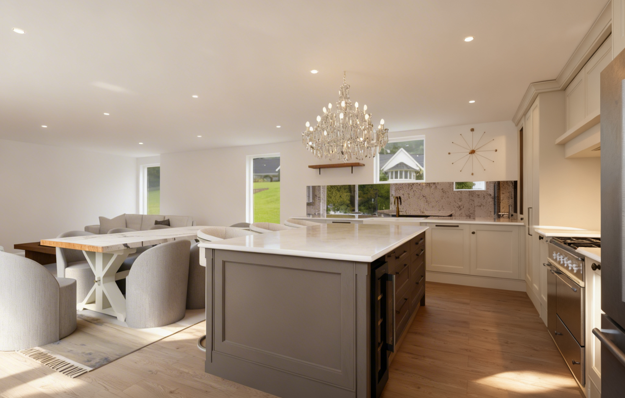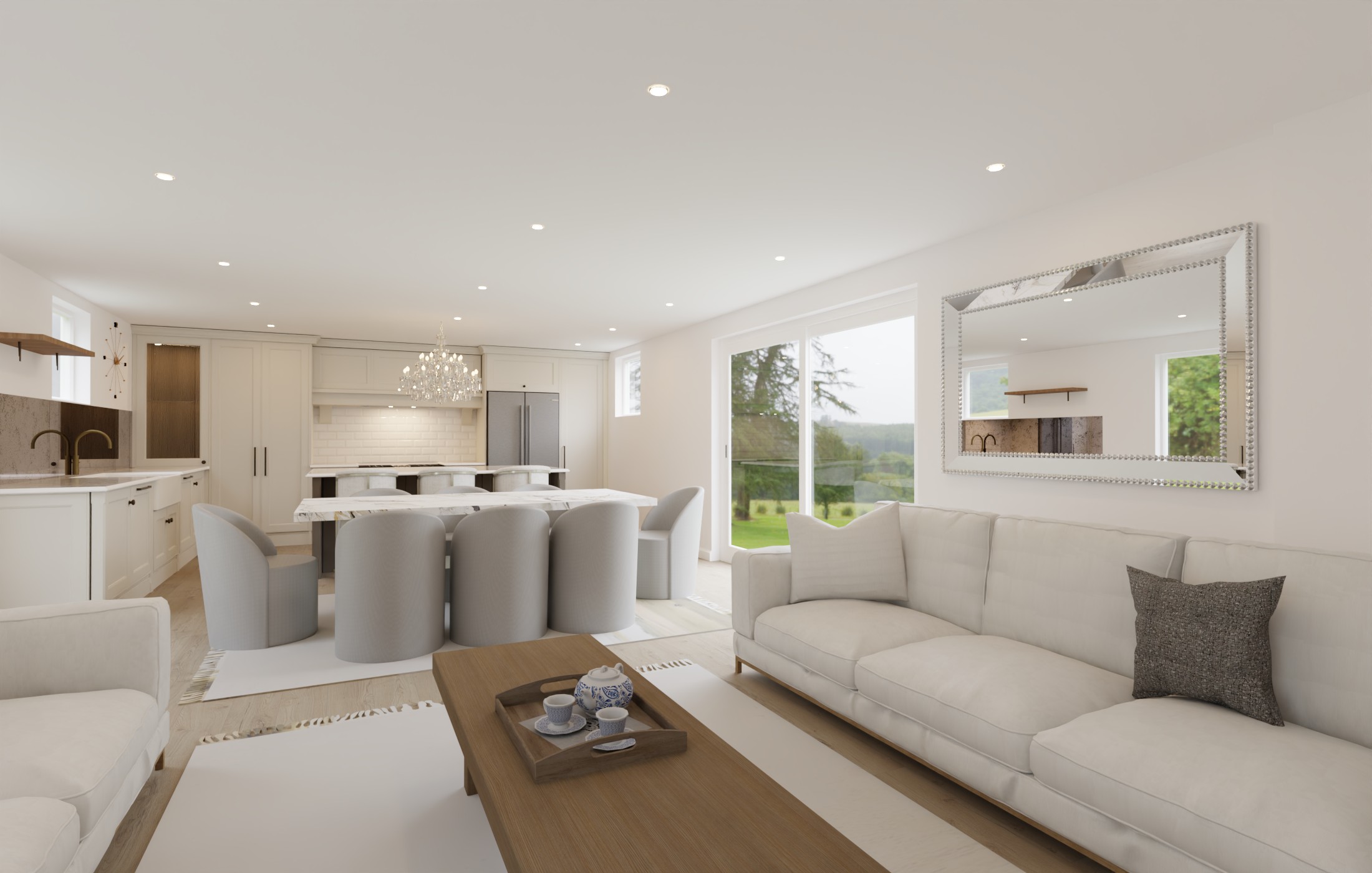 can you improve lighting don t change the colours don t change anything else the lights above the range is warm make the room brighter and add sunlight add cushions the sofas are velvet seamless the rug is also neutral patterned make the room brighter