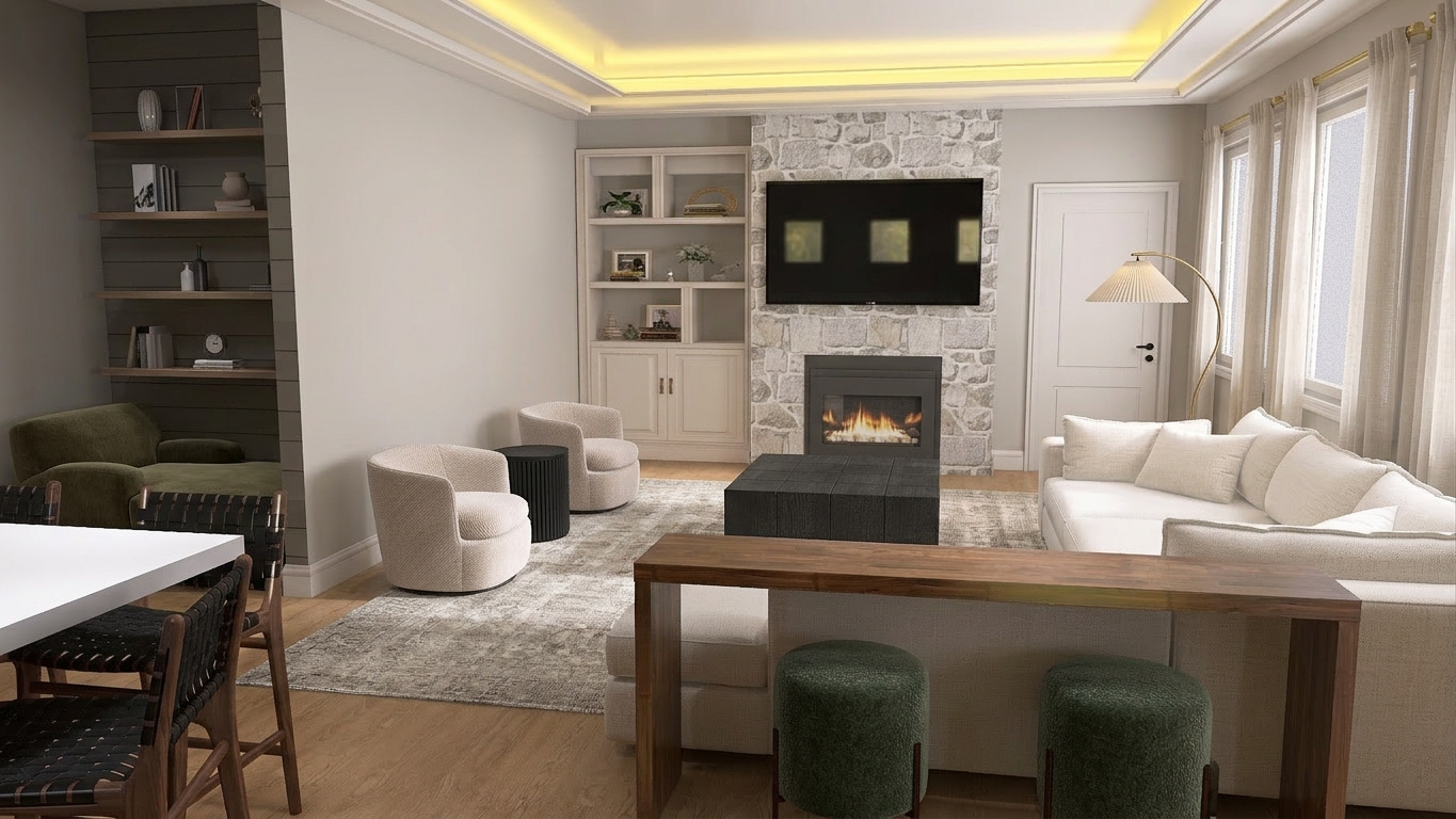 replace the swivel chairs with the two from the reference photo update the sectional to match the reference image and update the green ottoman styles add the olive green chaise tucked inside the shiplap reading nook add curtains from the reference image update the rug coffee table and floor lamp
