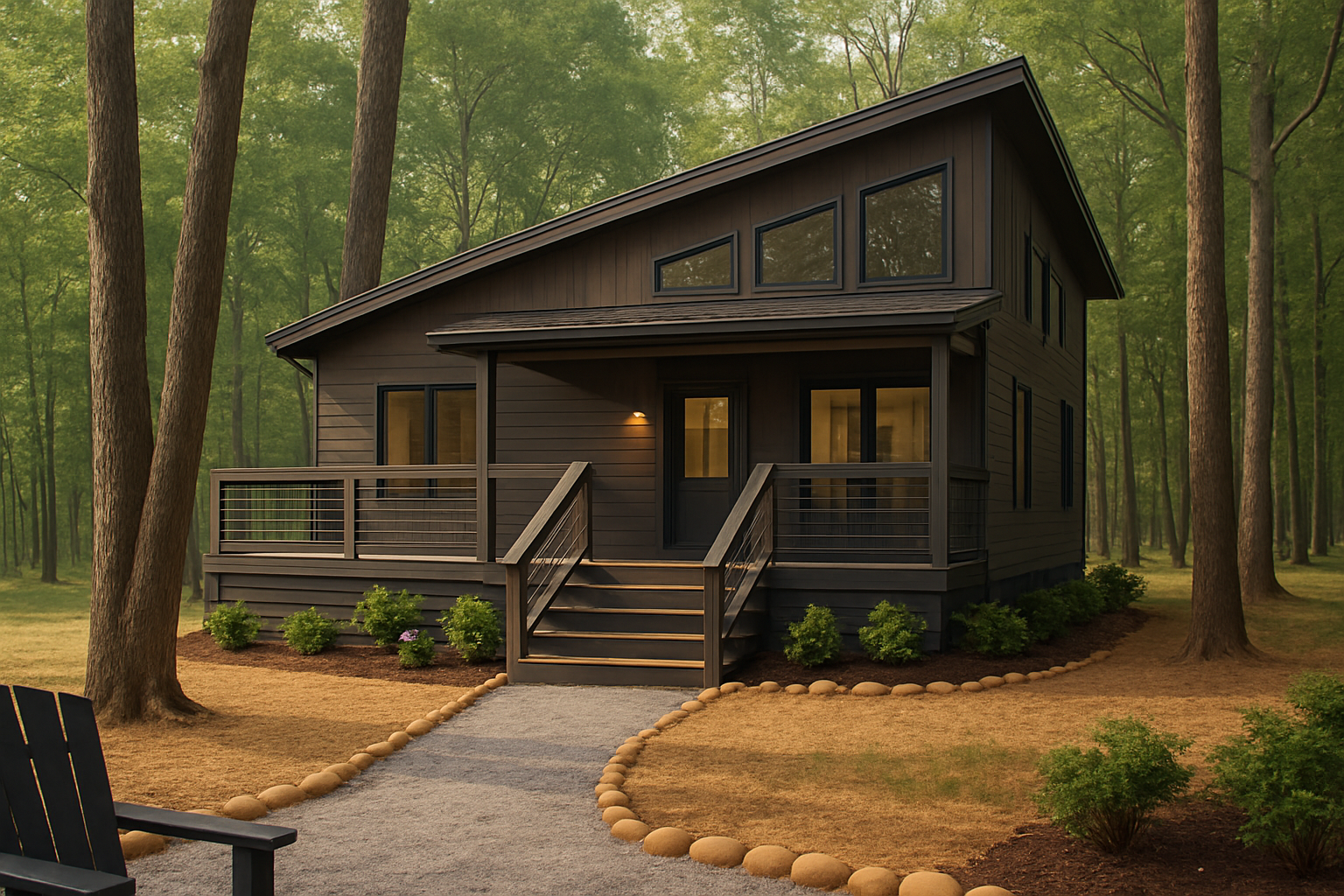 please make this rendering ultra realistic 8k version with string lights in the trees and people sitting by a firepit in aderondak chairs talking laughing and having a cocktail