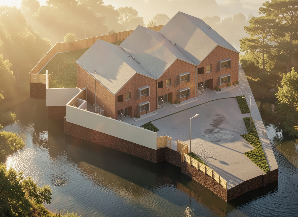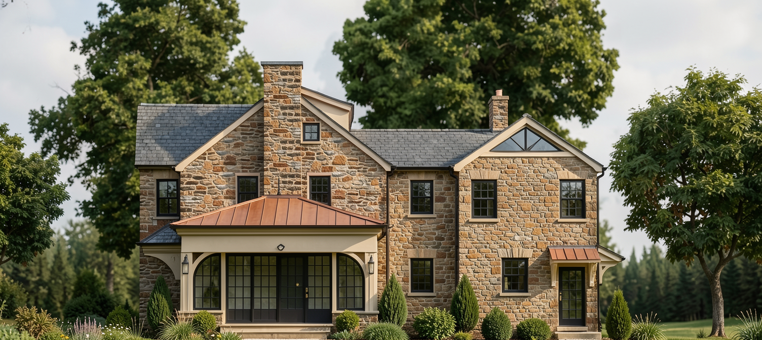 make photorealistic outdoor scene of this home setting midwest ohio small subdivision the lot is a little higher with tasteful landscaping and lawn black windows cream color siding