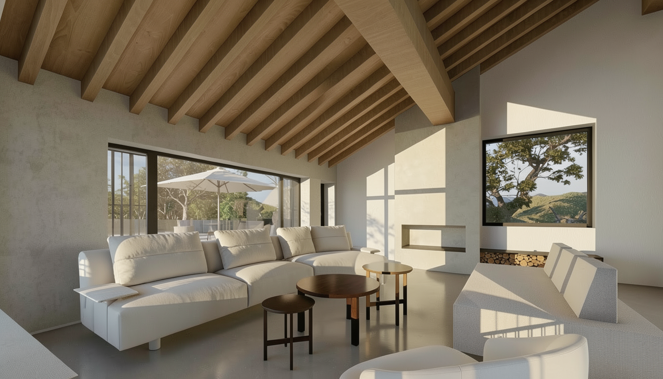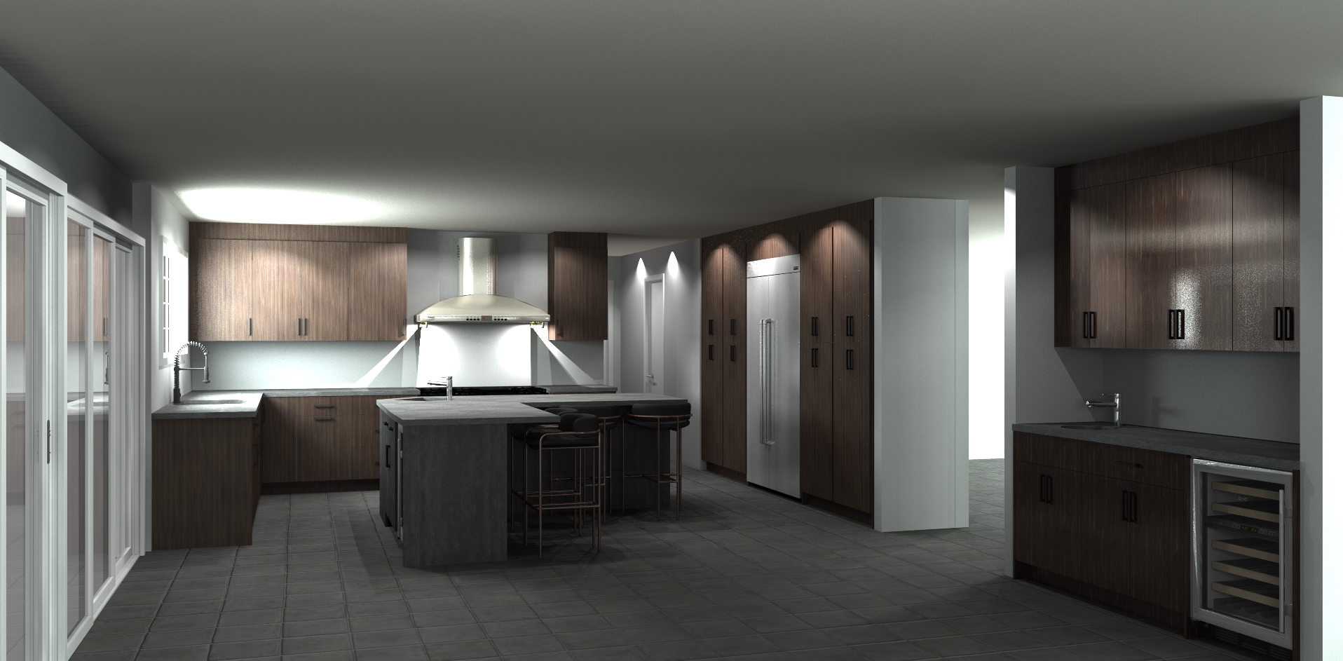 render this image while maintaining its original structure add full height stone backsplash to match countertop material maintain the cabinetry material but give the render an industrial loft vibe with accents of modern and clean replace the hood with a decorative hood made out of concrete