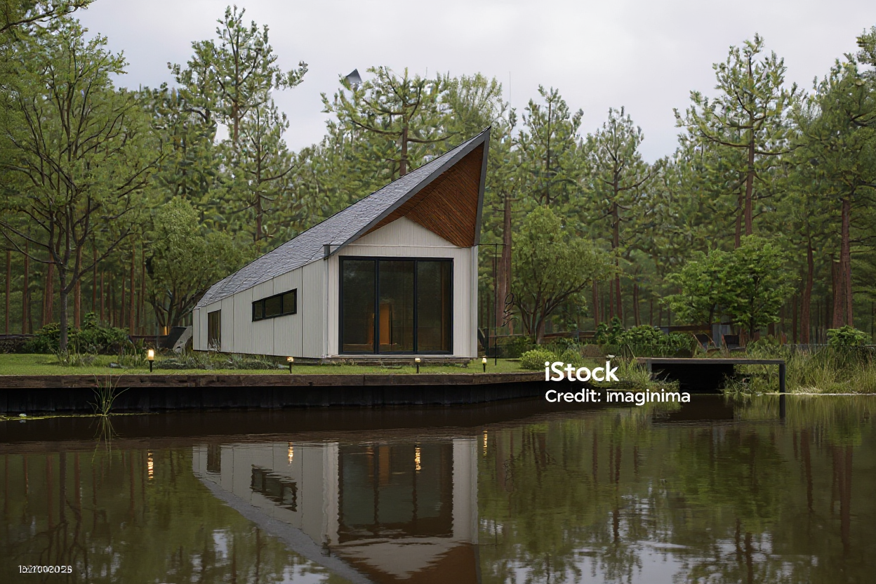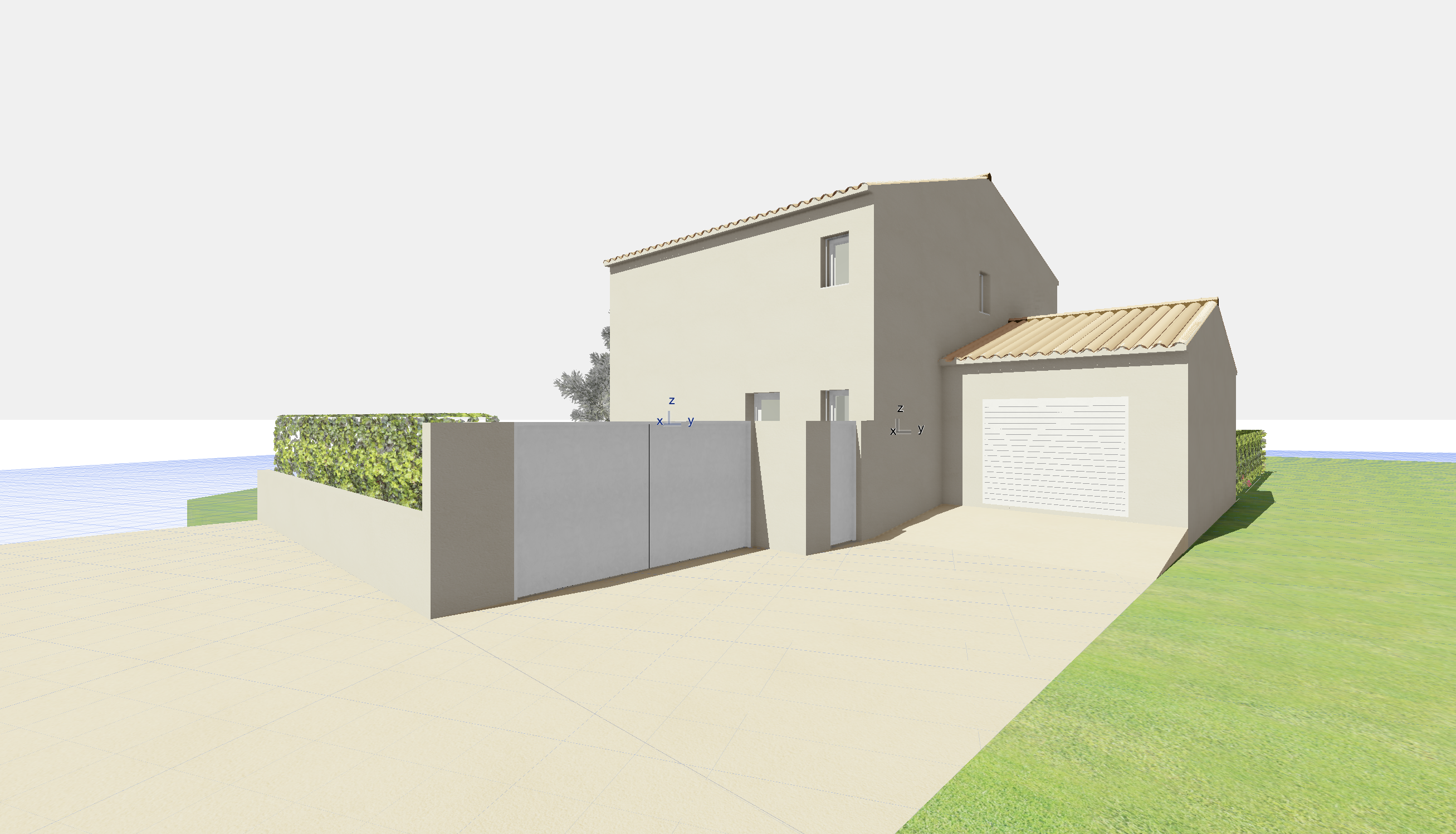 some mediterranean pine trees in the background and some olive trees lot of sunlight and reflects in the windows