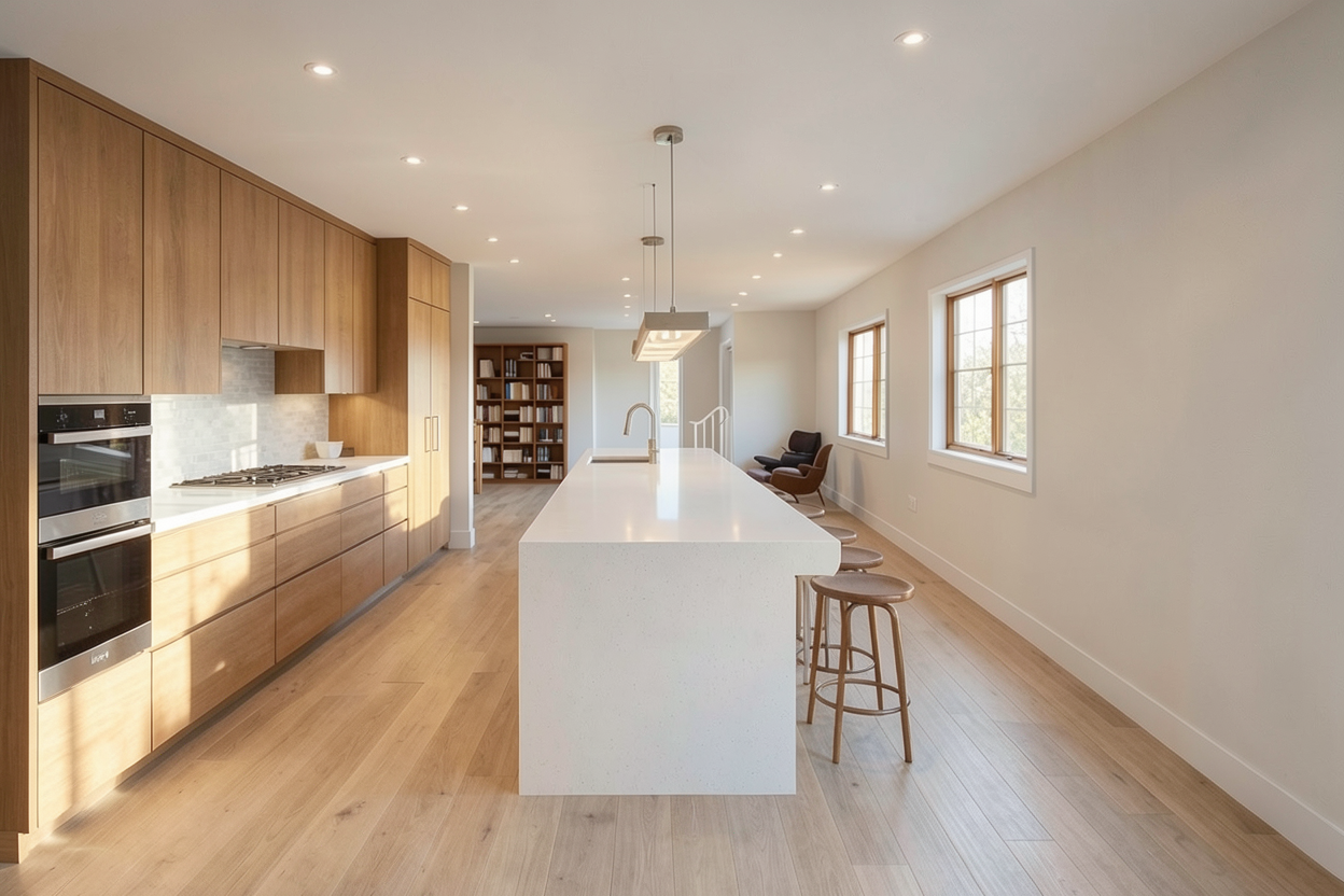 remove hanging lights barstools and add cabinets and countertop to the opposite side of the kitchen to match