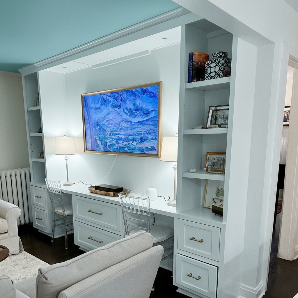 change the paint color of bookshelves and walls to light blue and the ceiling color to teal using the colors in the reference images