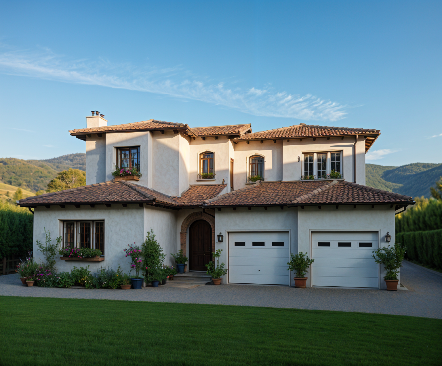 no arched windows and doors house background should be hills of pacific palisades california landscape front lawn area no wrought iron on windows put back window on left side upper floor architecture