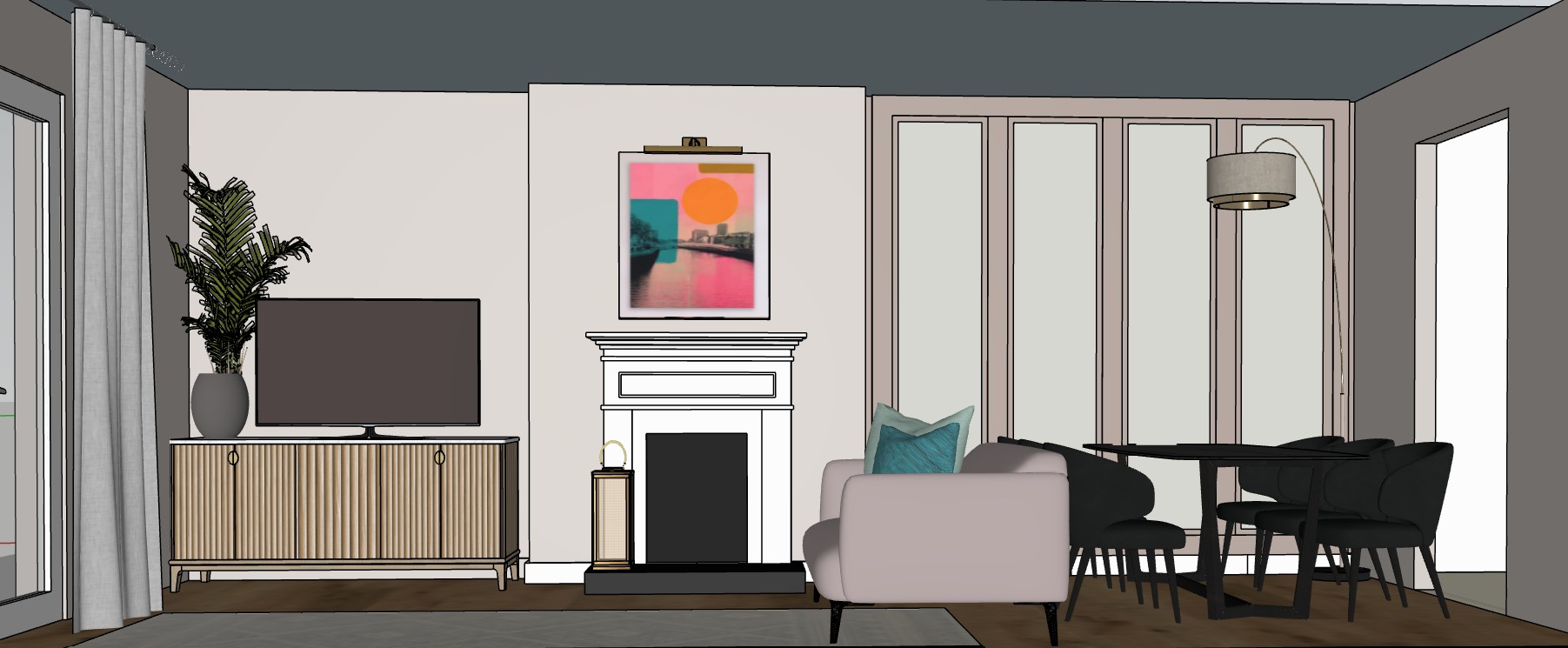 mirror to panelling pictyre light above painting on the wall floor lamp bright warm lighting