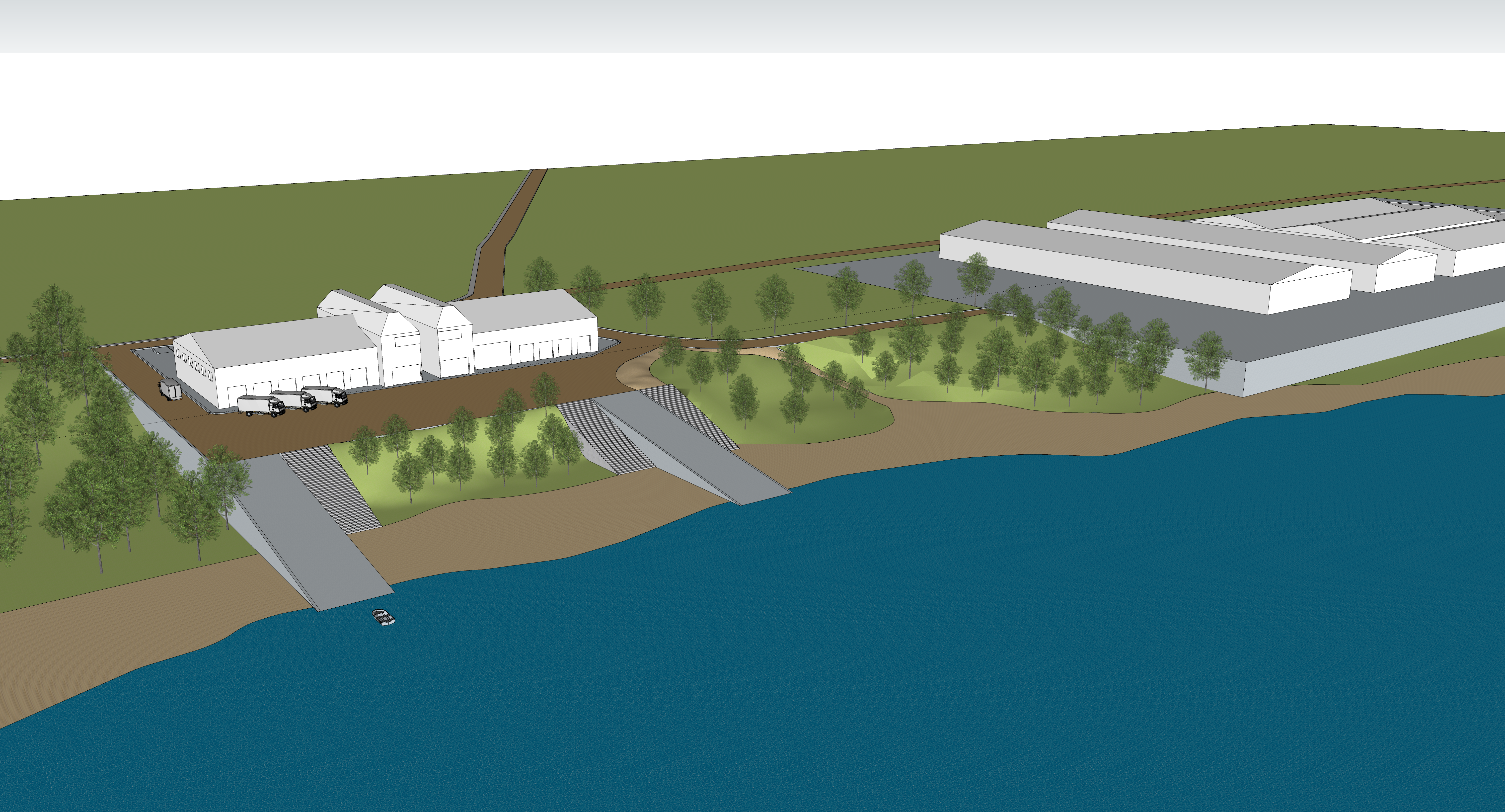 modernist exterior shot tropical shoreline with turquoise shallow water transitioning to deep blue sea small wooden fishing boats and dhows anchored near the beach a working port complex with a fish processing and cold storage facility in the foreground warm toned roofs and light industrial materials long concrete piers and ramps extending into the water people walking along the shore and piers at human scale large warehouse structures set back inland surrounded by palm trees green landscape buffers and sandy beach bright midday sunlight clear sky with soft clouds realistic shadows natural colors calm atmosphere aerial oblique view architectural visualization style realistic materials believable proportions no exaggerated forms architecture