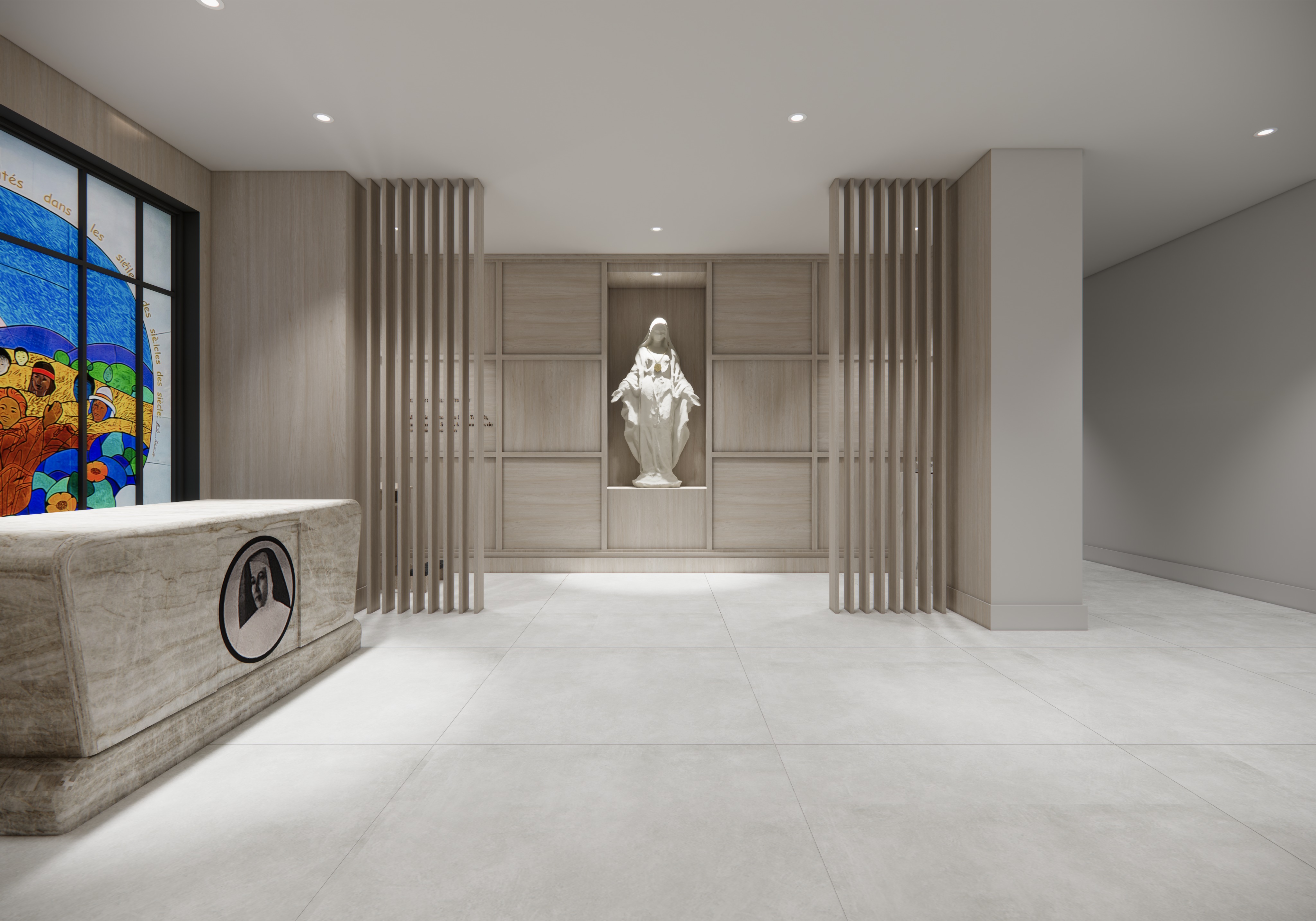 create a render in hyper realistic architectural visualization quality 8k resolution all objects furniture and architectural features must remain in place do not add any objects or delete anything from the image and let natural light in through the stained glass window on the left