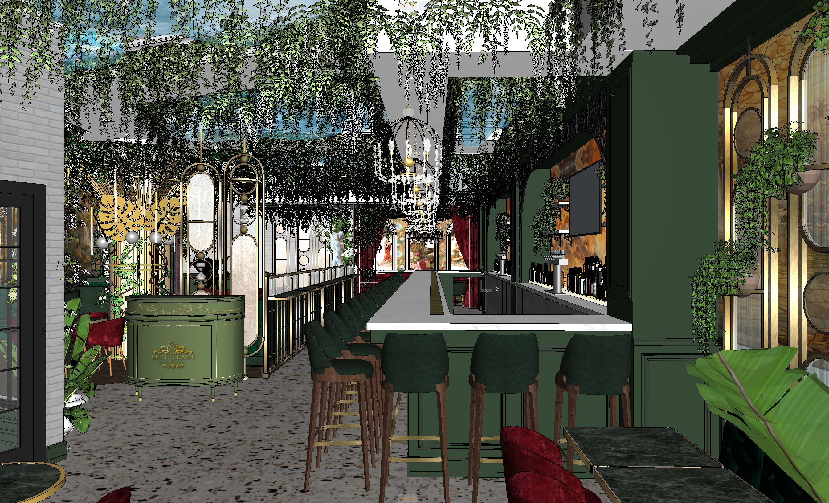 hyper realistic offline render prompt main bar perspective view toward central column feeder room 1 render type ultra photorealistic architectural interior render cinematic restaurant photography style offline render quality v ray corona level realism 8k resolution ultra detailed textures no geometry changes 2 lighting primary atmospheric tool time of day early evening golden hour primary light sources warm 2700k chandelier lighting aligned above central aisle integrated led strips embedded within central brushed brass rod column vertical cylindrical pendant lights surrounding column back bar illuminated stone wall emitting warm ambient glow ceiling cloud inspired fixtures with internal lightning effect producing soft diffused cool illumination subtle accent lighting beneath bar shelving soft reflected light from fluted glass partitions light temperature dominant warm 2700k interior lighting balanced with cooler diffused glow from cloud ceiling features light behavior soft natural falloff along bar counter physically accurate global illumination realistic shadow softness under bar stools and tables warm reflections on brushed brass details and green marble surfaces subtle light interaction on velvet upholstery controlled hdr exposure no blown highlights atmosphere remains warm layered and cinematic 3 materials physically accurate flooring natural wood parquet in herringbone pattern throughout dining zone secondary flooring near bar entrance terrazzo like stone surface with natural mineral texture banquettes and bar stools deep green velvet with visible nap direction and soft compression dining chairs rich burgundy velvet with soft folds and tactile depth tabletops polished green marble with realistic veining and brushed gold edge banding bar counter top white stone surface with subtle natural variation and realistic reflection central sculptural column vertical brushed brass rods with micro scratches and anisotropic reflections large brushed gold monstera leaves integrated into column embedded led strips within rods emitting warm vertical glow round globe fixtures with diffused glass light fluted glass panels and partitions with accurate distortion and reflections all metallic finishes brushed brass only no chrome no plastic no artificial gloss 4 styling restaurant realism bar and dining tables fully styled porcelain plates linen napkins polished cutlery multiple crystal wine glasses with realistic reflections and refractions bar shelving populated with bottles creating depth and natural randomness subtle imperfections in marble brass and wood velvet texture clearly visible reflections visible on marble and stone surfaces 5 atmosphere elegant intimate yet vibrant dining environment dense cascading greenery overhead with white wisteria only cloud like ceiling fixtures with lightning effect enhancing theatrical ambiance strong linear perspective along bar counter visual depth toward feeder room framed by red curtains and lush greenery cinematic contrast between warm brass and deep green tones soft depth of field enhancing spatial hierarchy 6 camera eye level architectural photography 35mm lens equivalent linear composition emphasizing bar perspective natural perspective without distortion slight depth of field focusing mid frame 7 final realism enhancer high dynamic range ultra detailed textures physically accurate light behavior real world scale no cgi look no plastic materials no artificial glow artifacts no overprocessed highlights luxury hospitality realism emphasizing the illuminated bar axis leading toward the monumental brushed brass monstera column and lush suspended greenery canopy