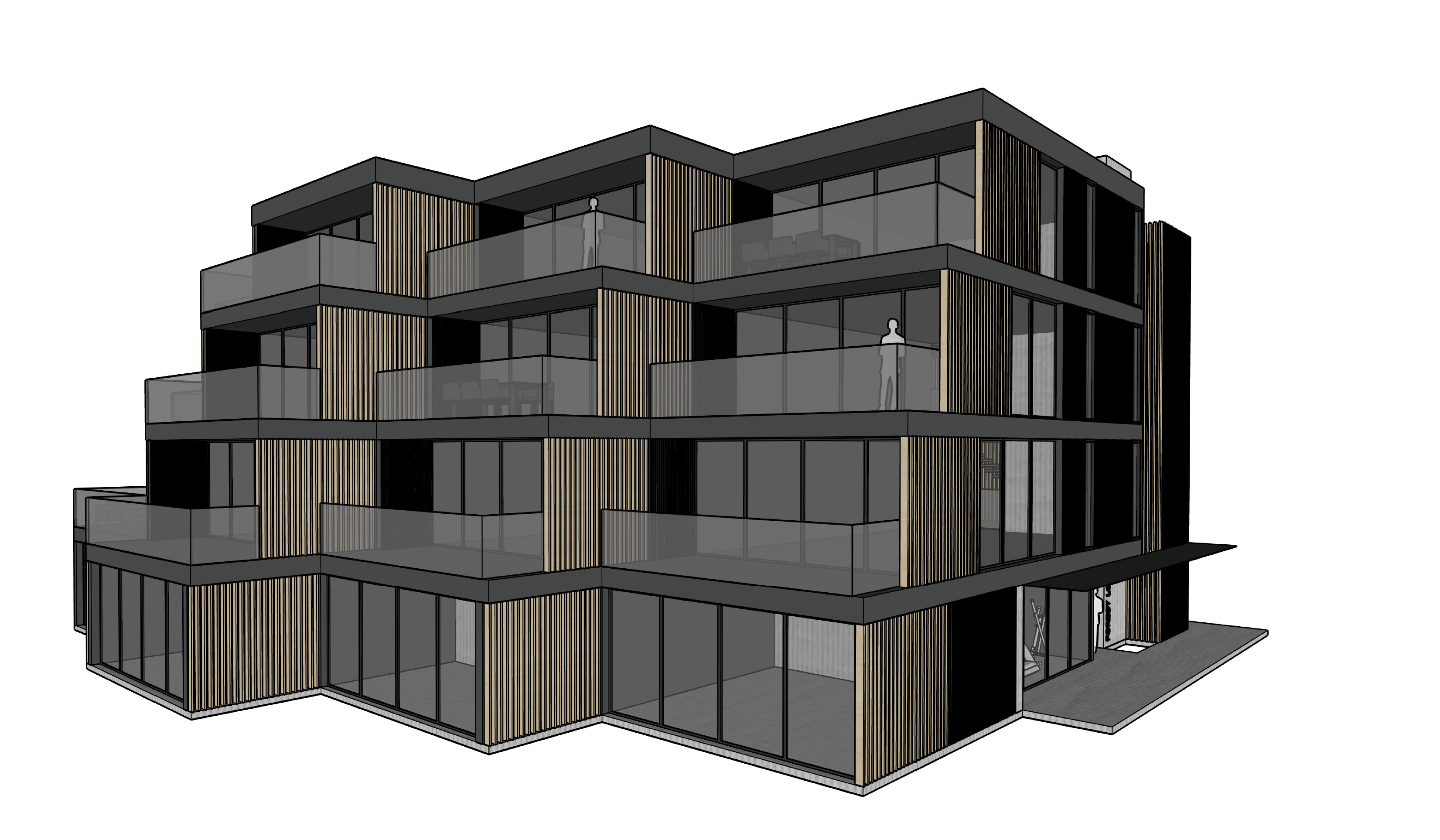apartment building adjacent to the forest retain materiality and provide setting of pnw trees and early morning fog with dim lights