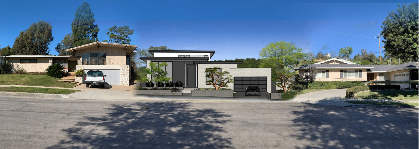 modern californian house with lush landscaping beige travertine facade with black basalt stone accents flat roof with greenery foreground features vibrant green grass purple and red flowering plants palm trees sky is bright blue with soft fluffy clouds atmosphere is serene and inviting evoking a tranquil coastal vibe