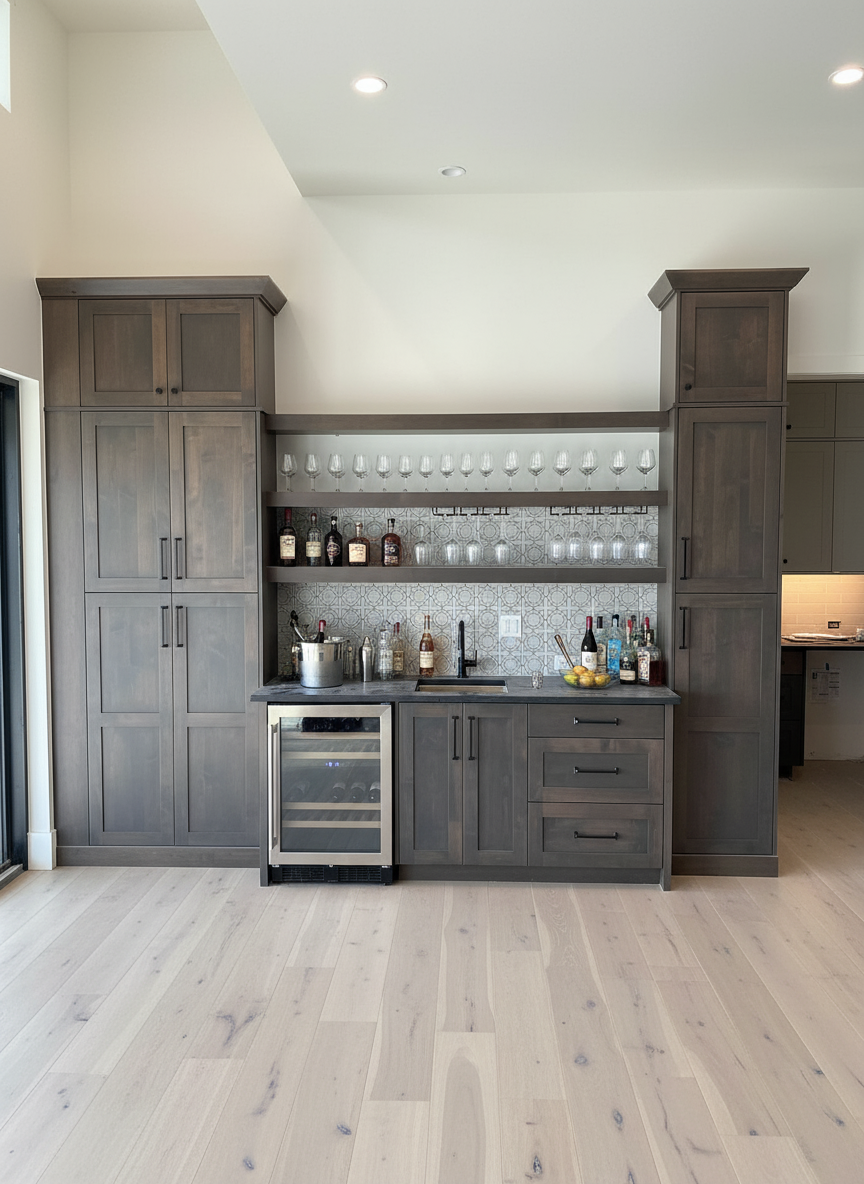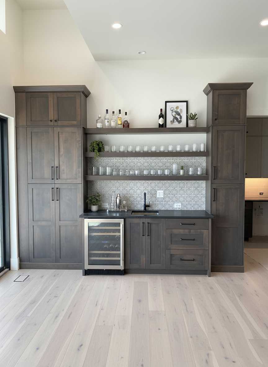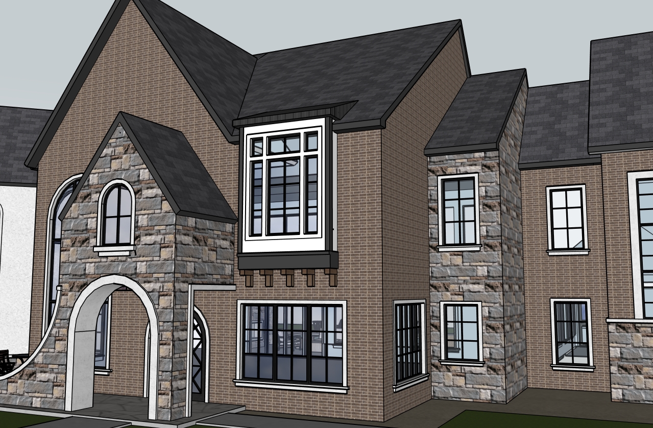 render a luxurious country mansion with an elegant modern design emphasize the light gray stone facade contrasted with rich brown brick textures the sleek dark tiles of the roof should accentuate the overall grandeur surround the mansion with lush greenery focusing on vibrant purple flowers and maintained green grass highlight the large arched windows and the subtle details of the intricate entrances capture the scene during a serene clear blue sky day creating a tranquil and inviting atmosphere