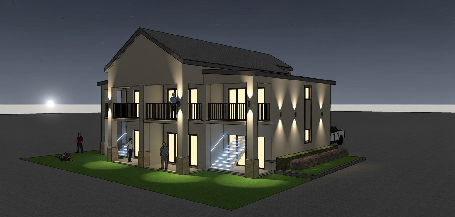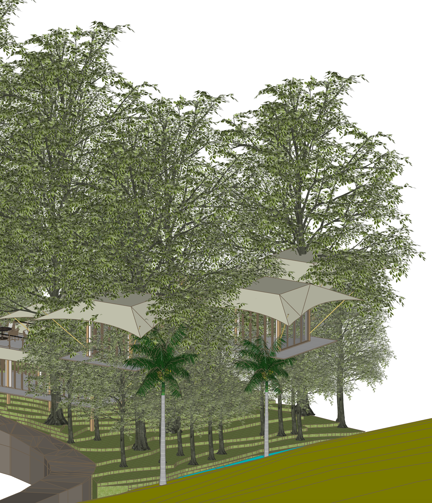 archsynth render from a low top down drone angle focused tightly on the tent roof surfaces maintain the exact 3d building arrangement and camera constraints show detailed texture of the light brown tent roofs merging harmoniously with surrounding dense forest vegetation the narrow road briefly appears at the front edge of the shot with the river visible deeper down the slope preserve realistic daylight canopy shadows and natural roof highlights