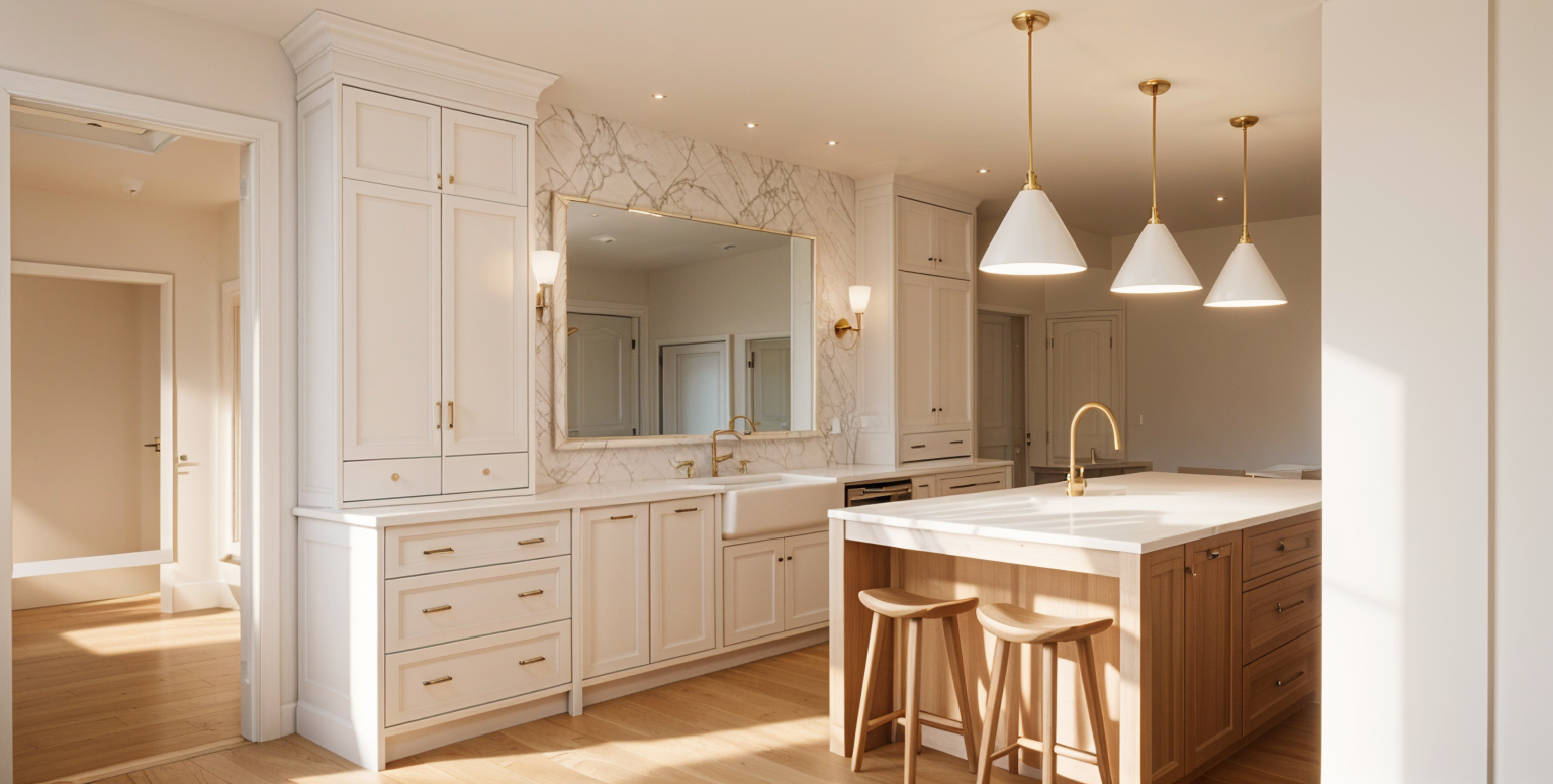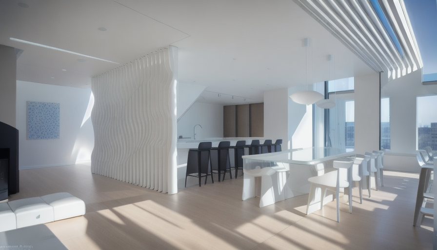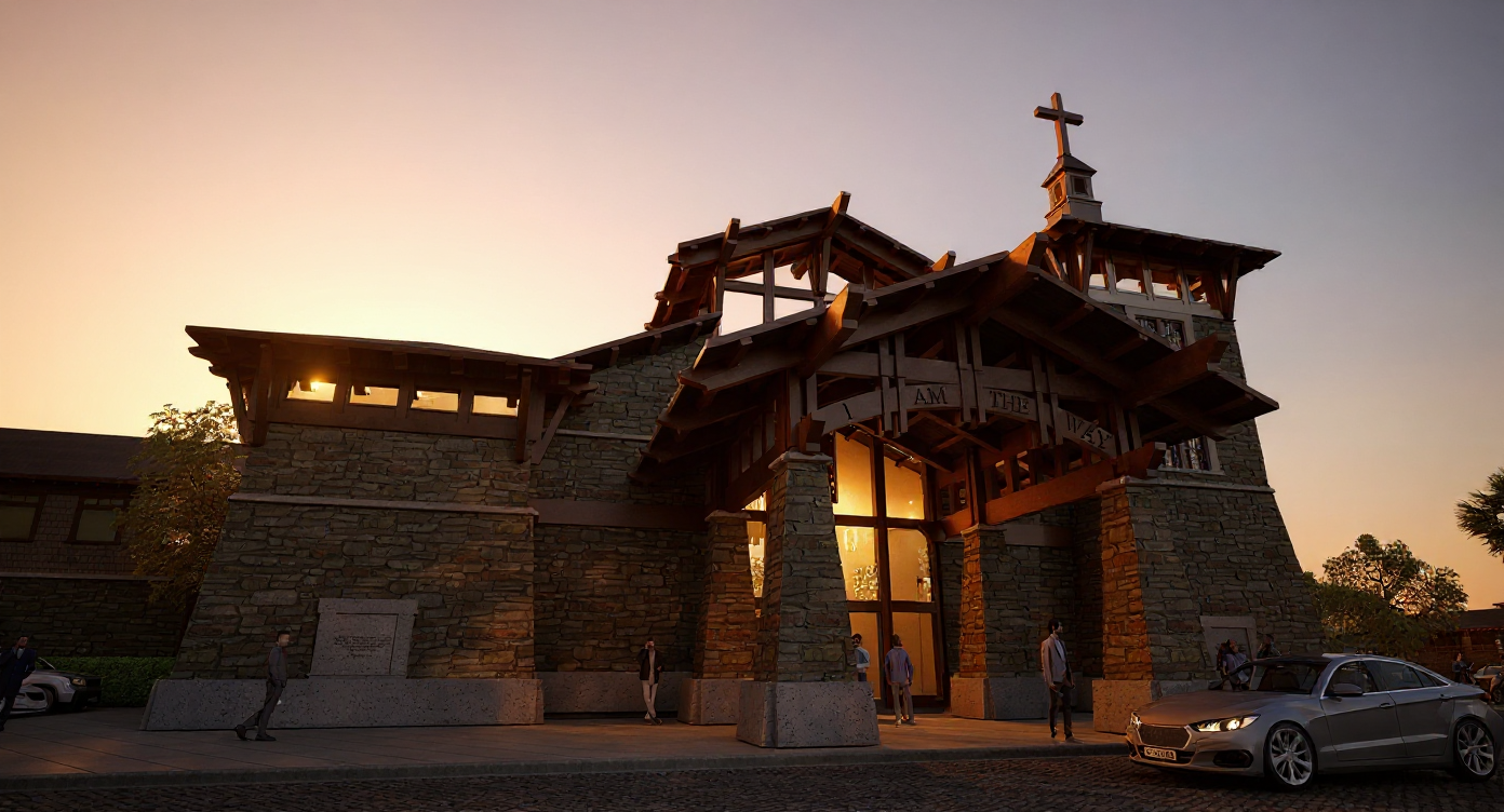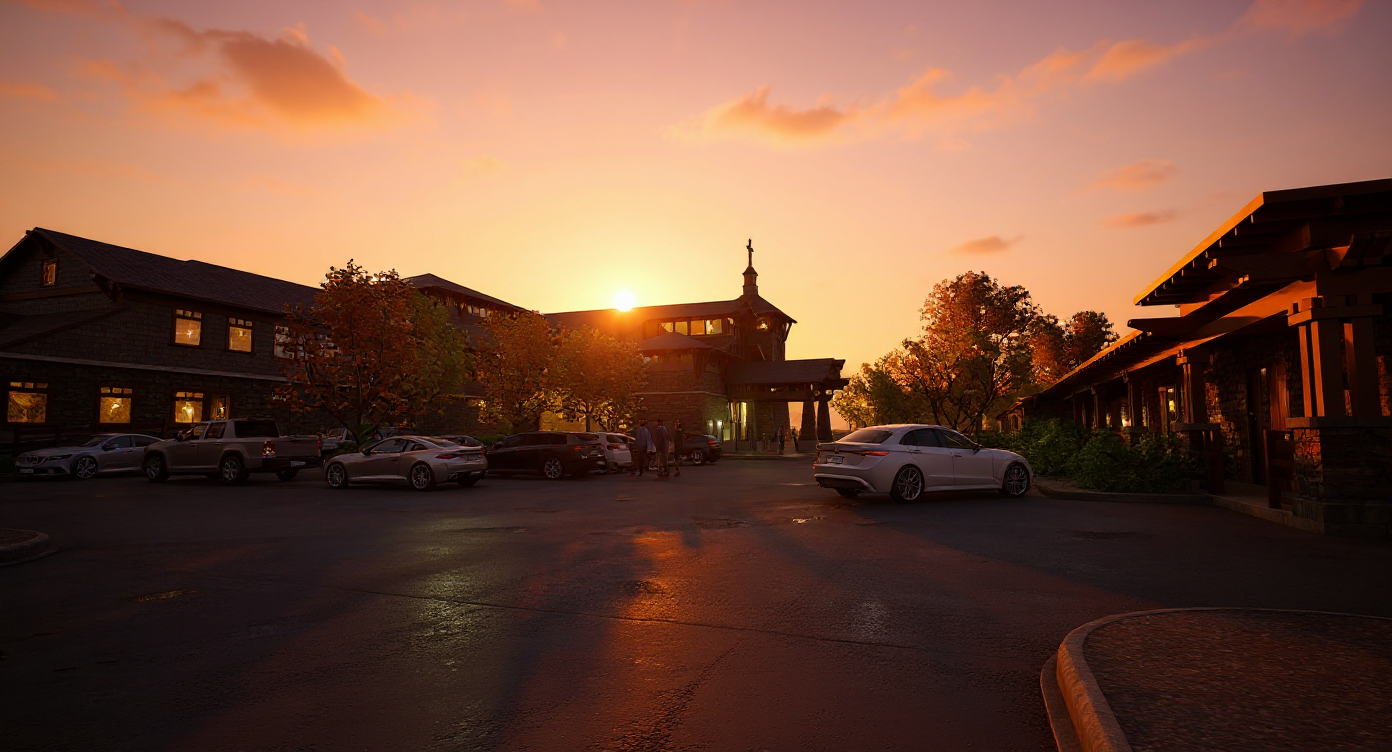 turn into photo realistic rendering with bright california sunrise shining at front and bright lights inside the building shining through all the windows add street lights and lights shining on the horse statue
